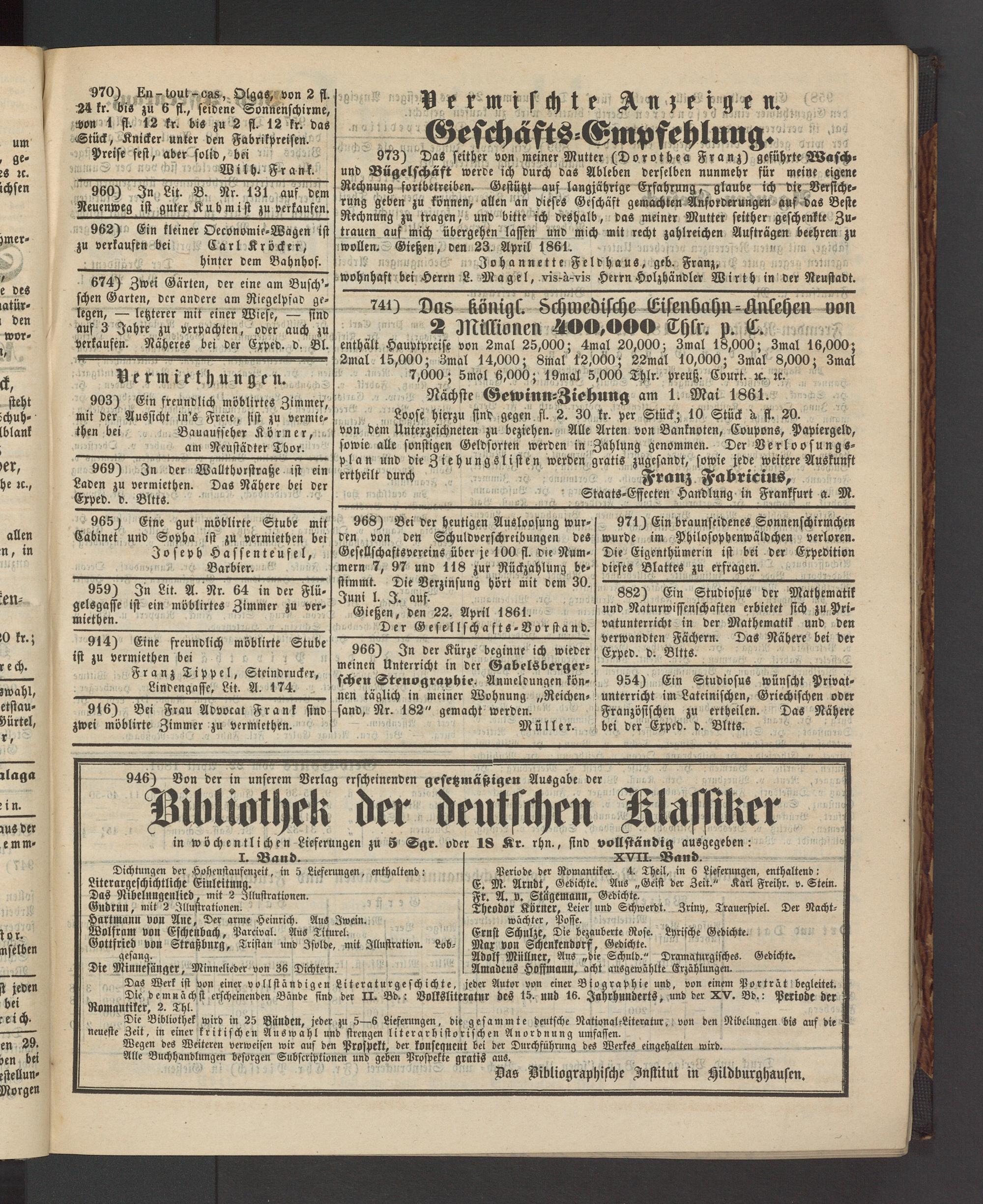 Anzeigeblatt für die Provinzialhauptstadt Gießen. 1840-1867