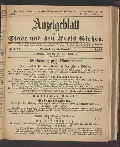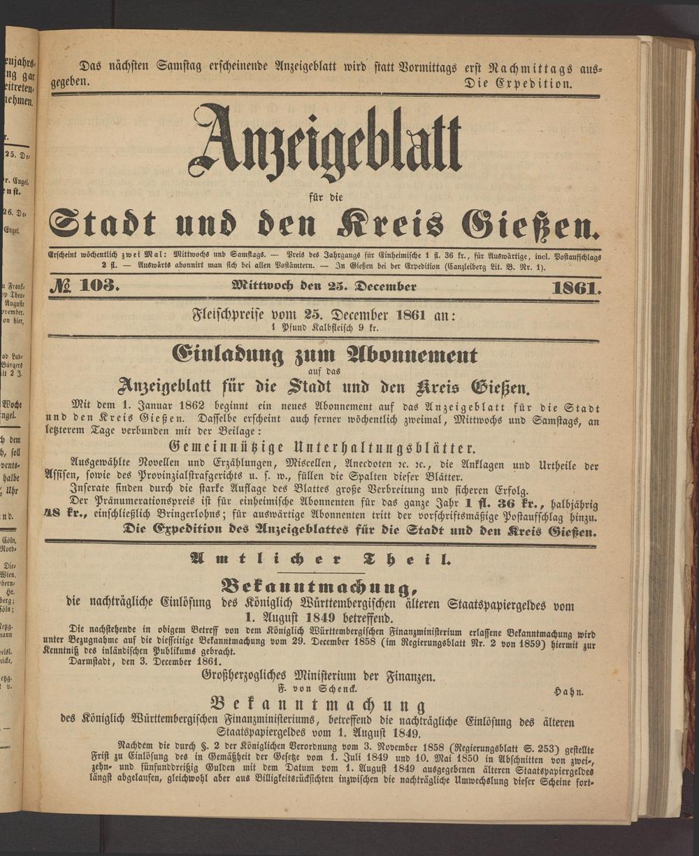 Anzeigeblatt für die Provinzialhauptstadt Gießen. 1840-1867
