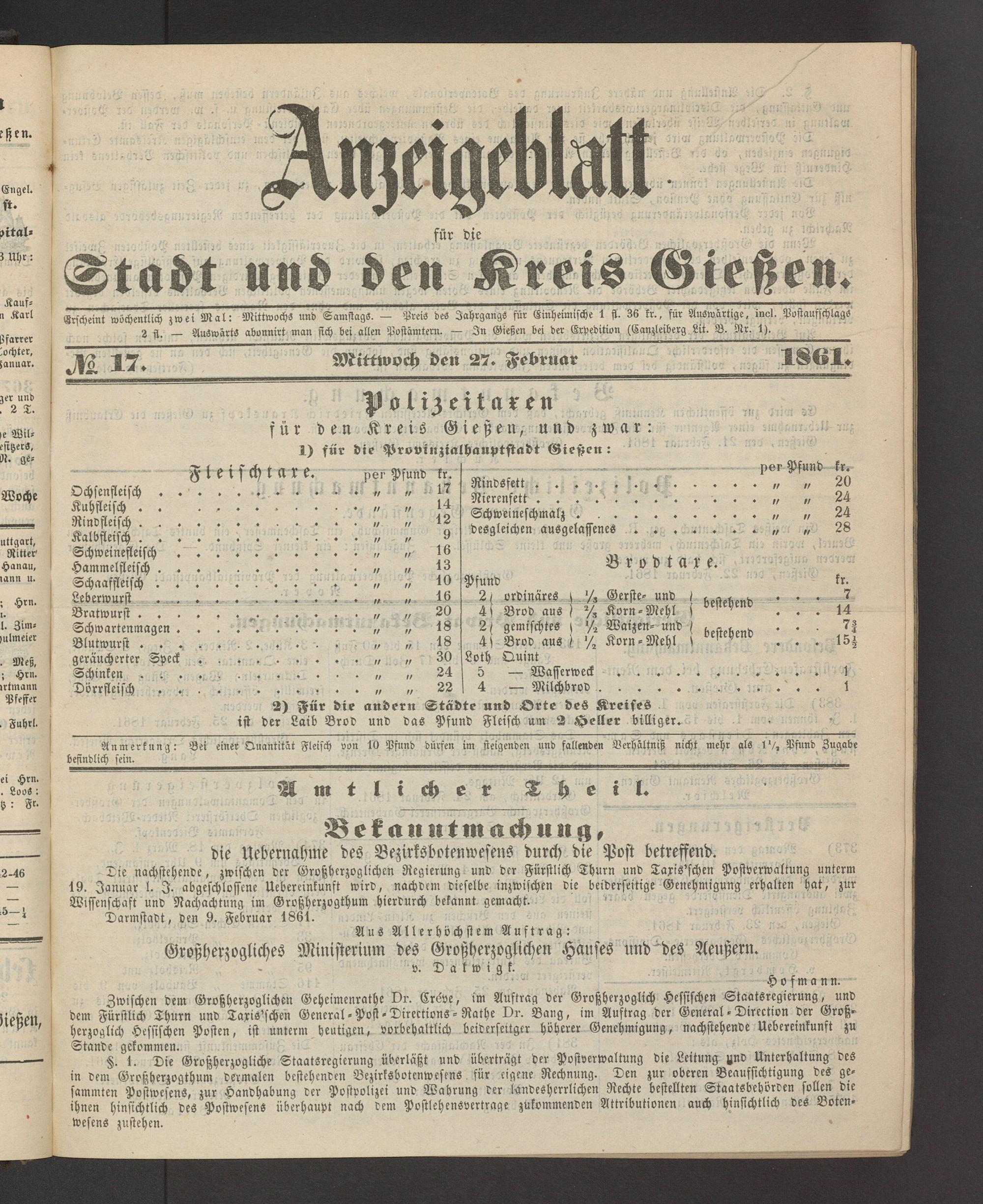 Anzeigeblatt für die Provinzialhauptstadt Gießen. 1840-1867
