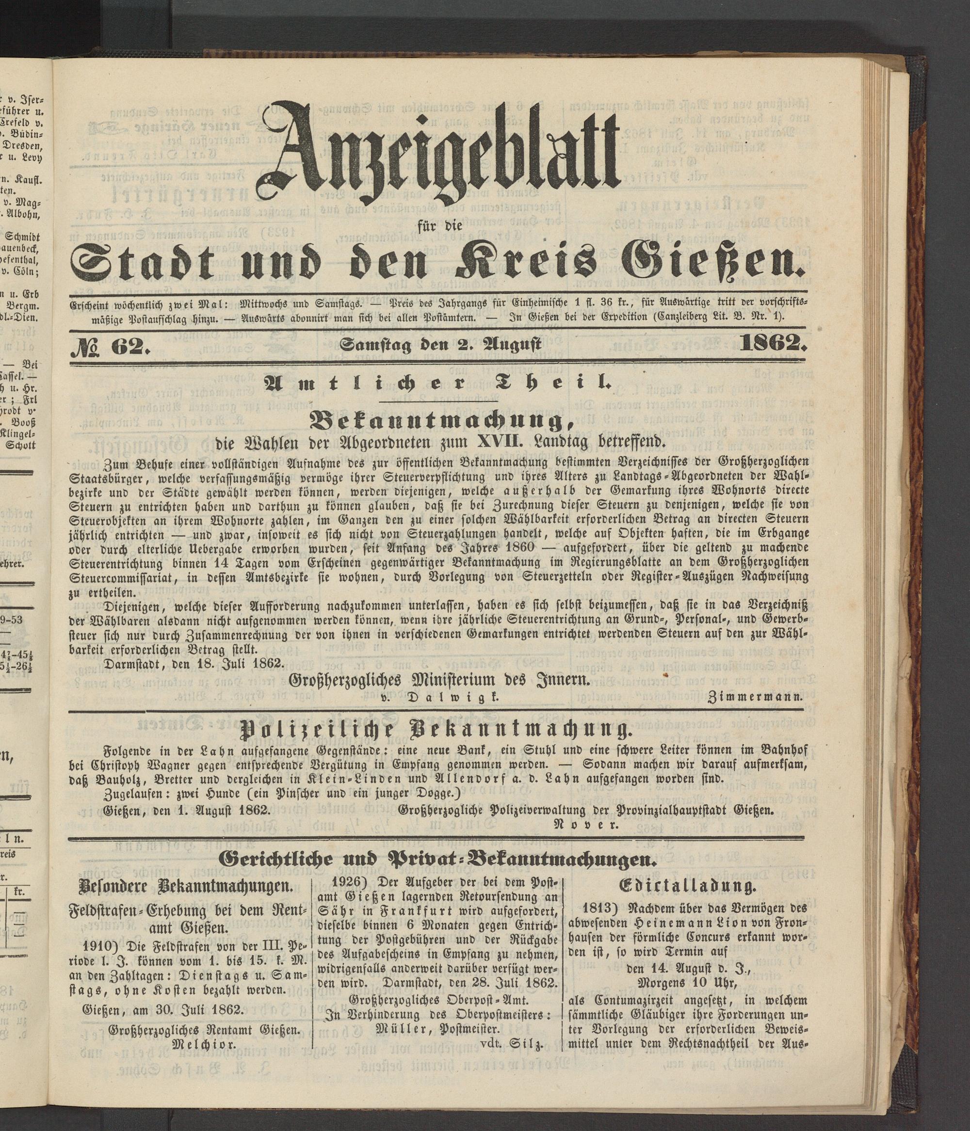 Anzeigeblatt für die Provinzialhauptstadt Gießen. 1840-1867