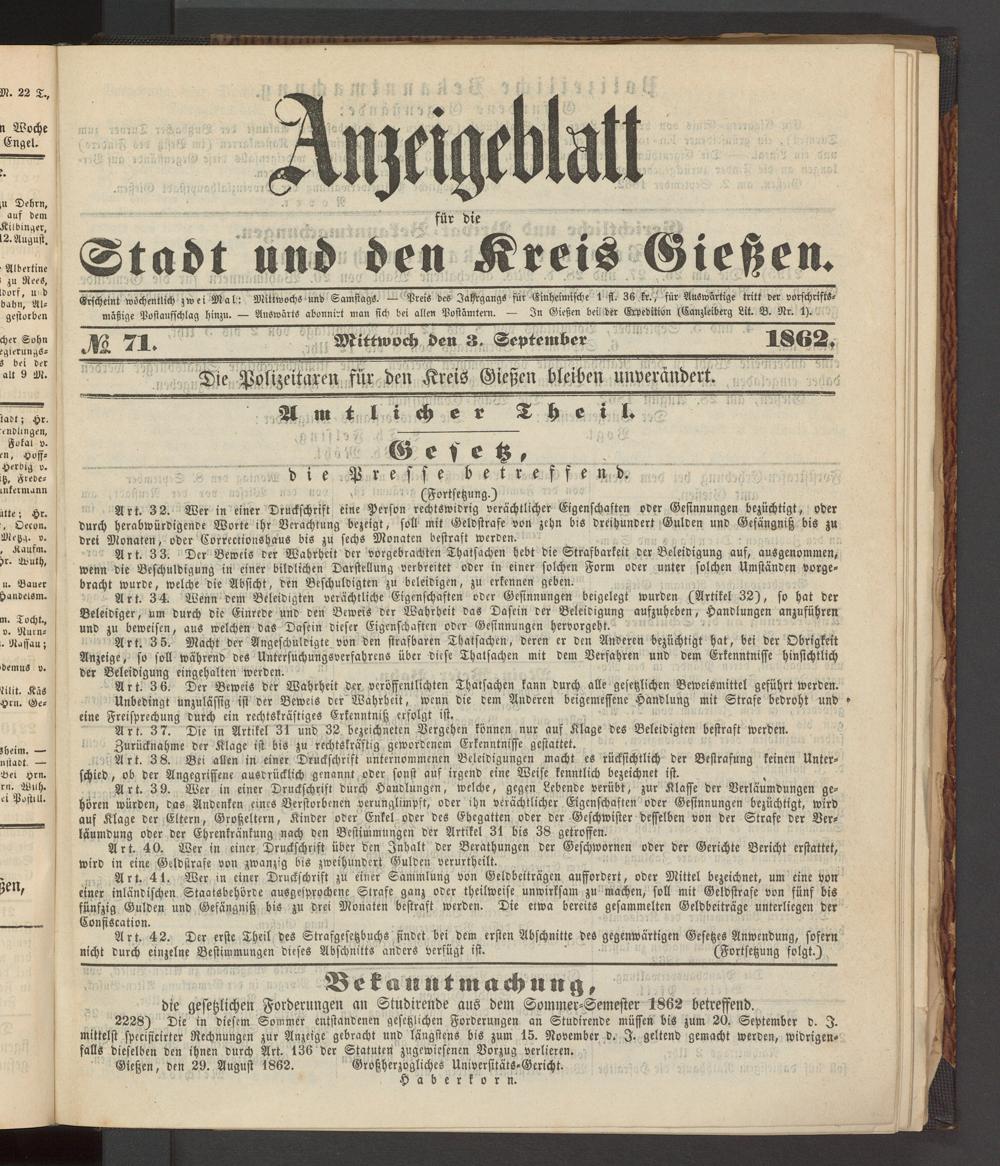 Anzeigeblatt für die Provinzialhauptstadt Gießen. 1840-1867