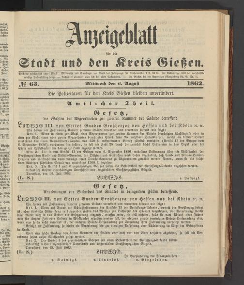 Anzeigeblatt für die Provinzialhauptstadt Gießen. 1840-1867