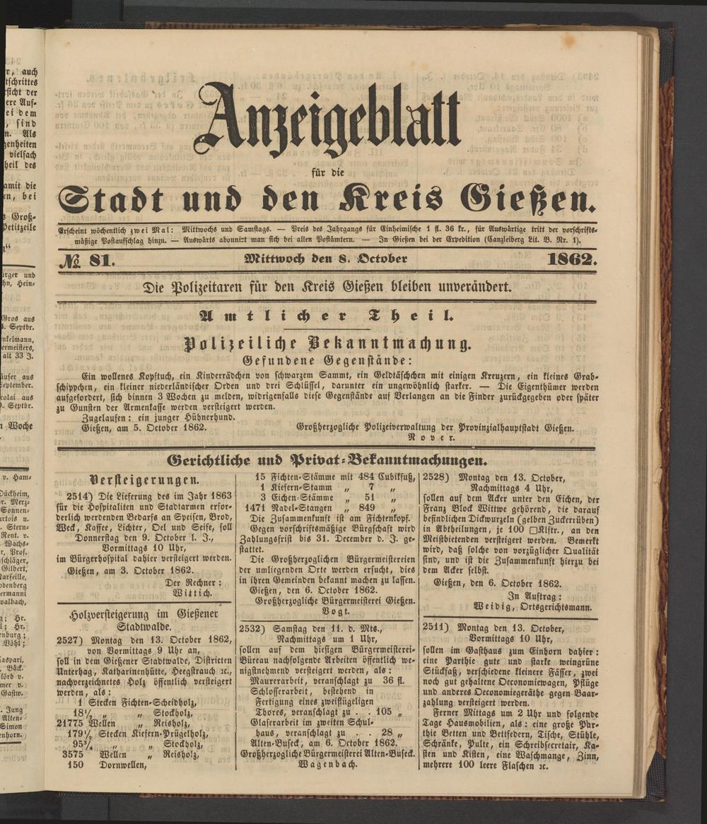Anzeigeblatt für die Provinzialhauptstadt Gießen. 1840-1867
