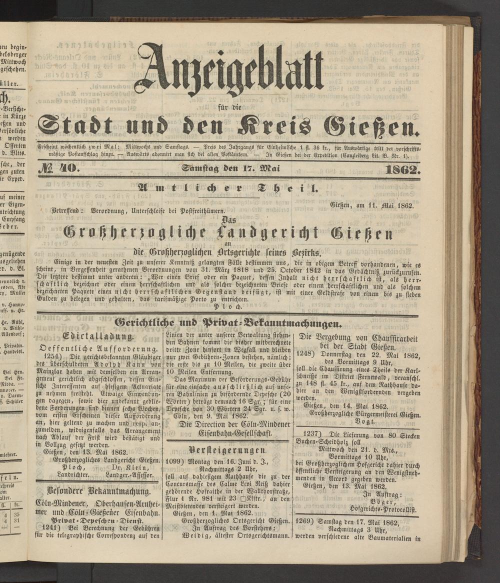 Anzeigeblatt für die Provinzialhauptstadt Gießen. 1840-1867