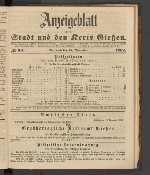 Anzeigeblatt für die Provinzialhauptstadt Gießen. 1840-1867