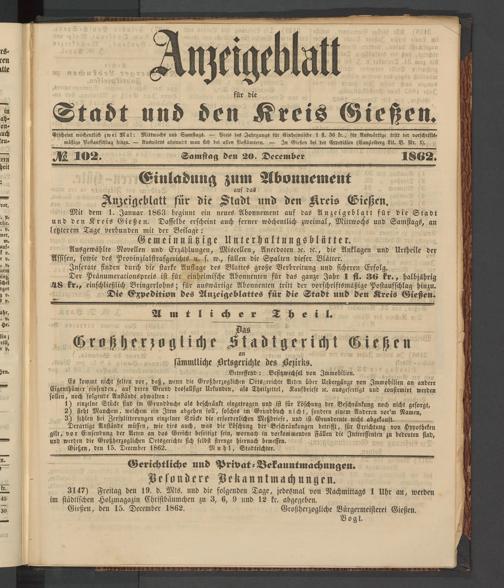 Anzeigeblatt für die Provinzialhauptstadt Gießen. 1840-1867