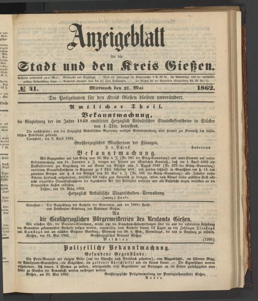 Anzeigeblatt für die Provinzialhauptstadt Gießen. 1840-1867