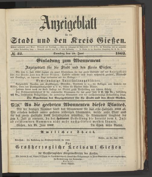 Anzeigeblatt für die Provinzialhauptstadt Gießen. 1840-1867
