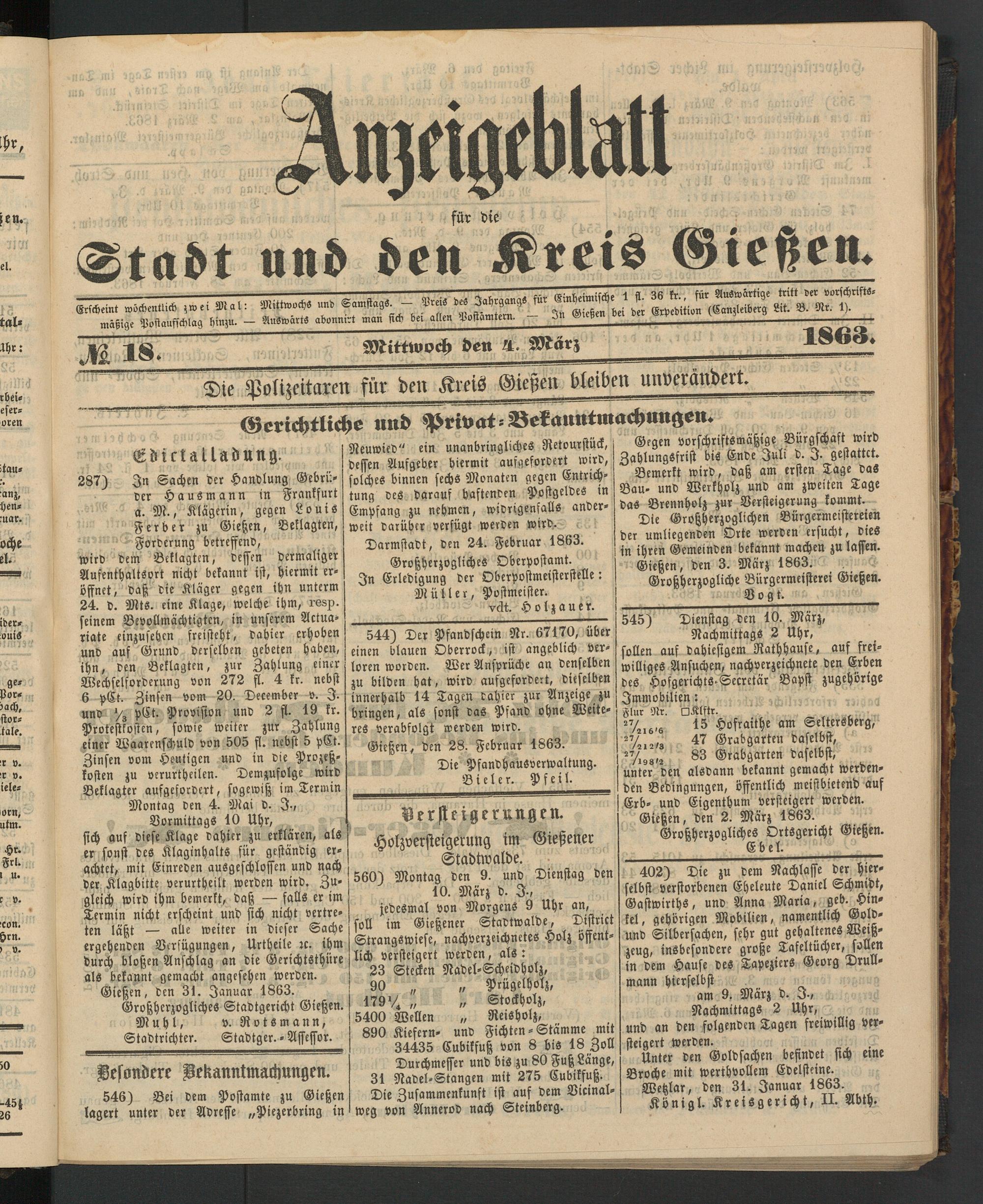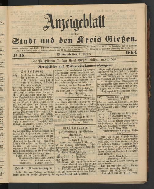 Anzeigeblatt für die Provinzialhauptstadt Gießen. 1840-1867