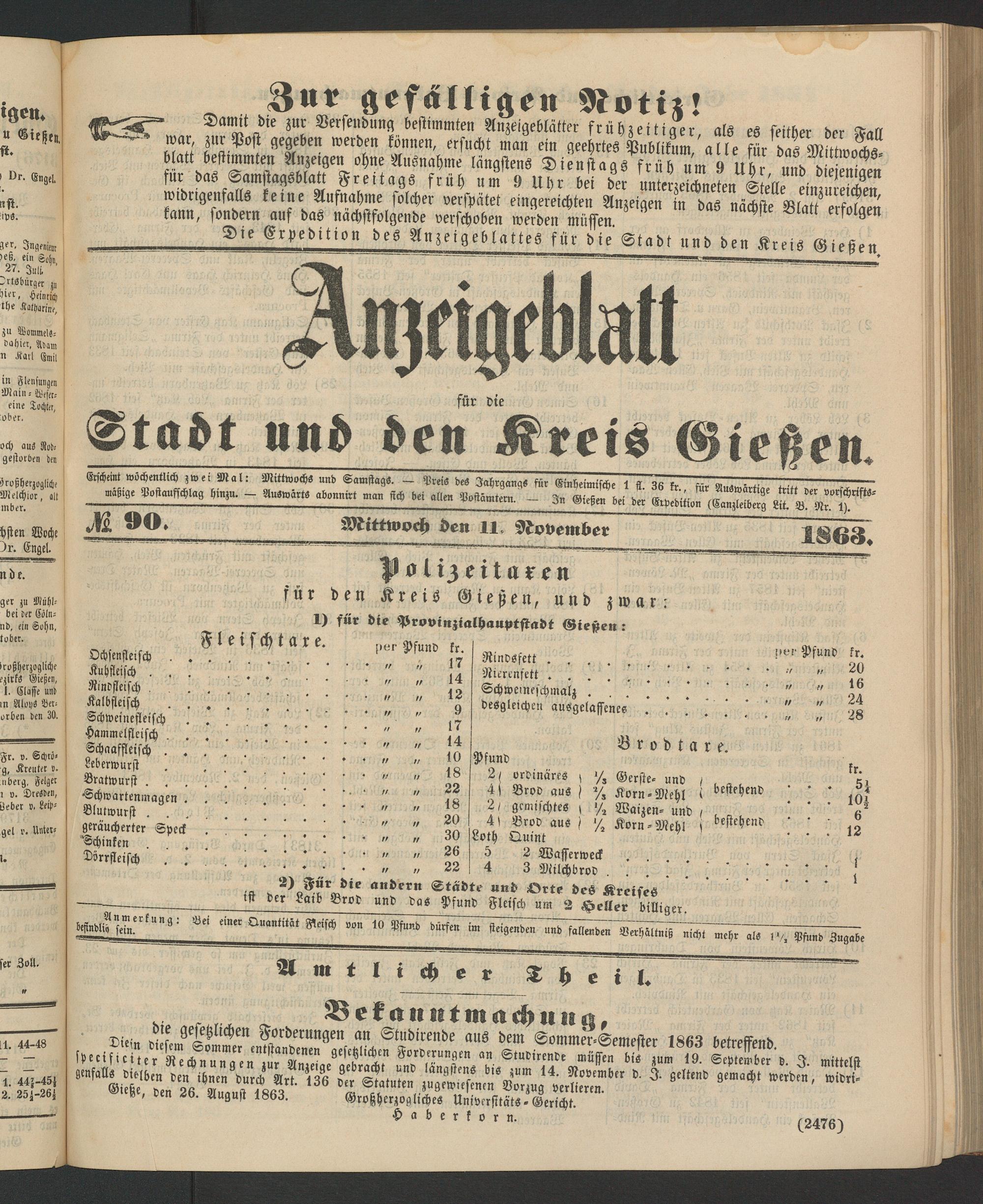 Anzeigeblatt für die Provinzialhauptstadt Gießen. 1840-1867
