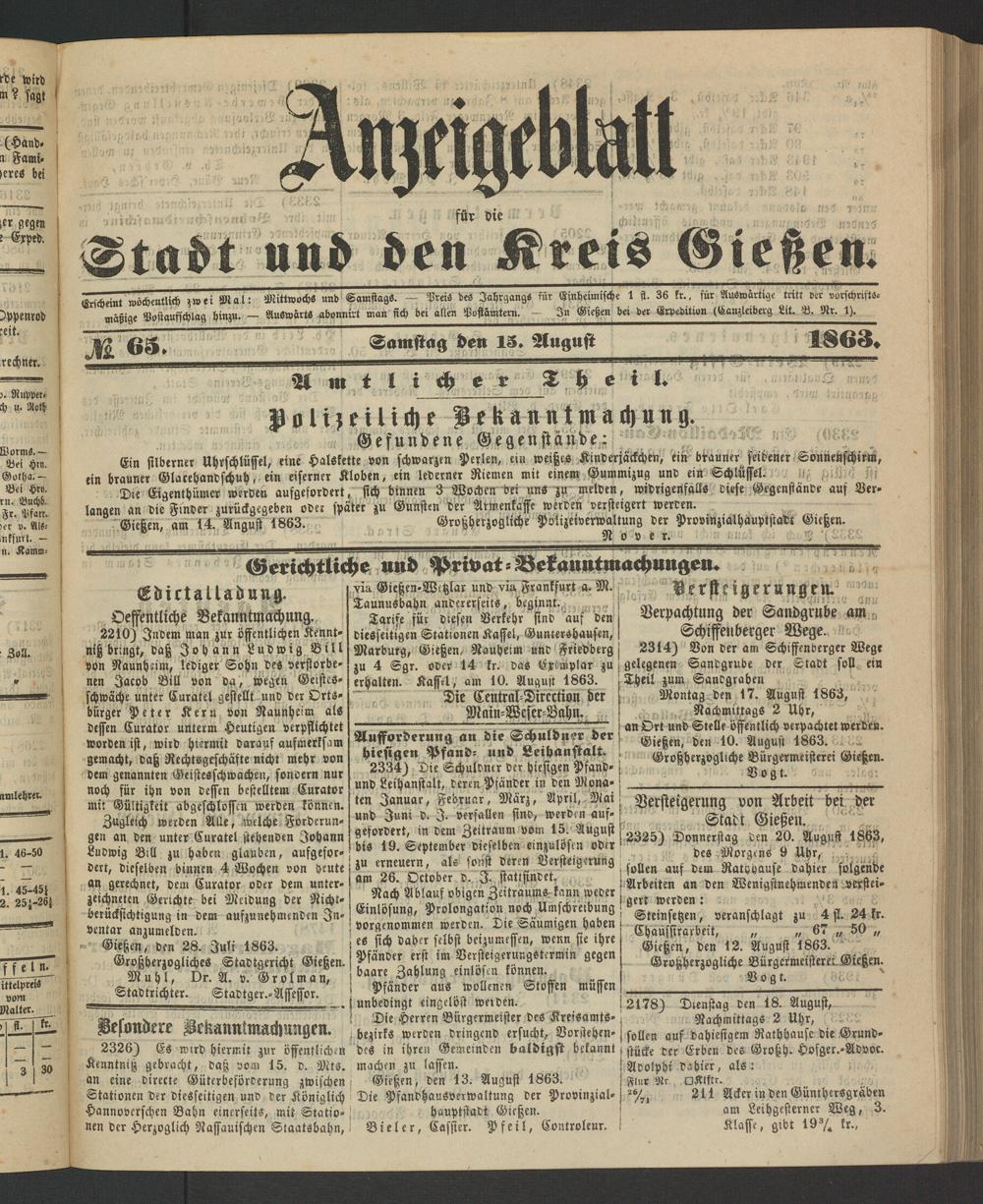 Anzeigeblatt für die Provinzialhauptstadt Gießen. 1840-1867
