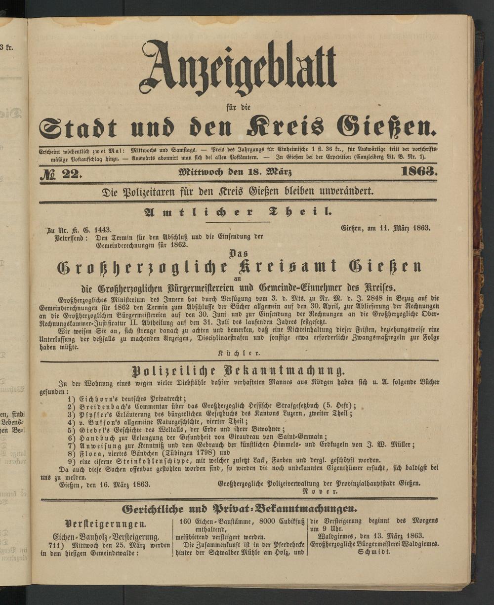 Anzeigeblatt für die Provinzialhauptstadt Gießen. 1840-1867