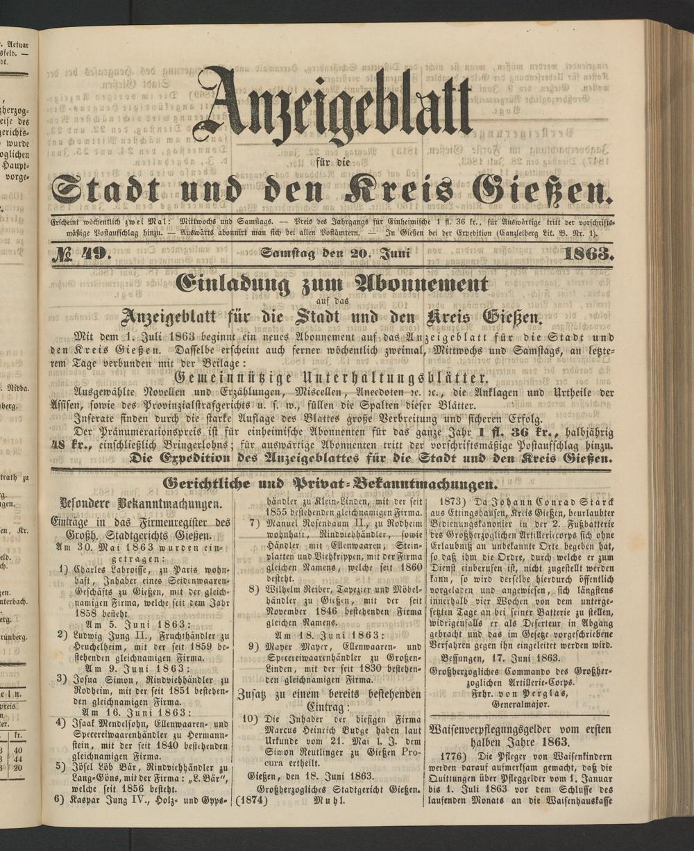 Anzeigeblatt für die Provinzialhauptstadt Gießen. 1840-1867