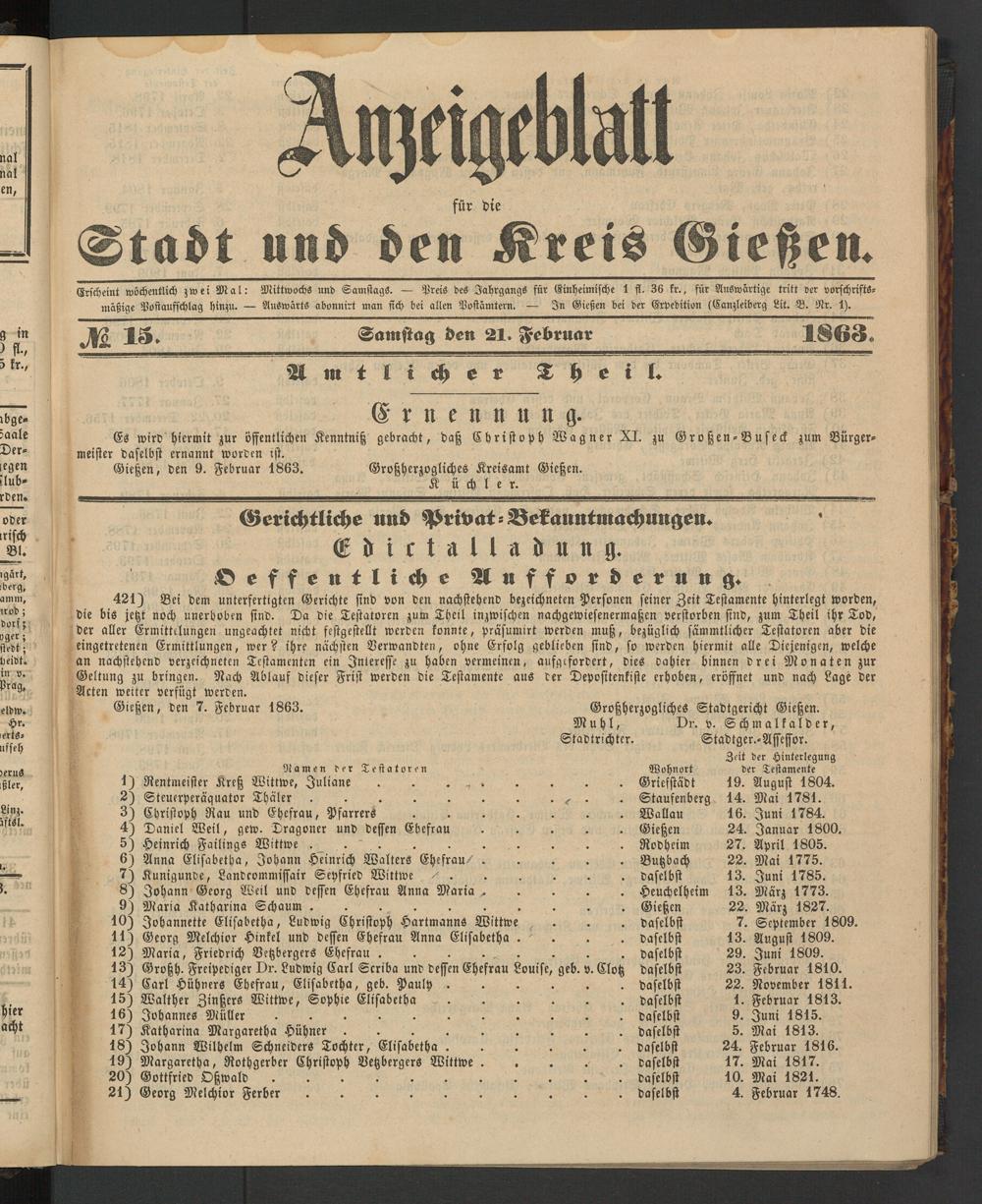 Anzeigeblatt für die Provinzialhauptstadt Gießen. 1840-1867