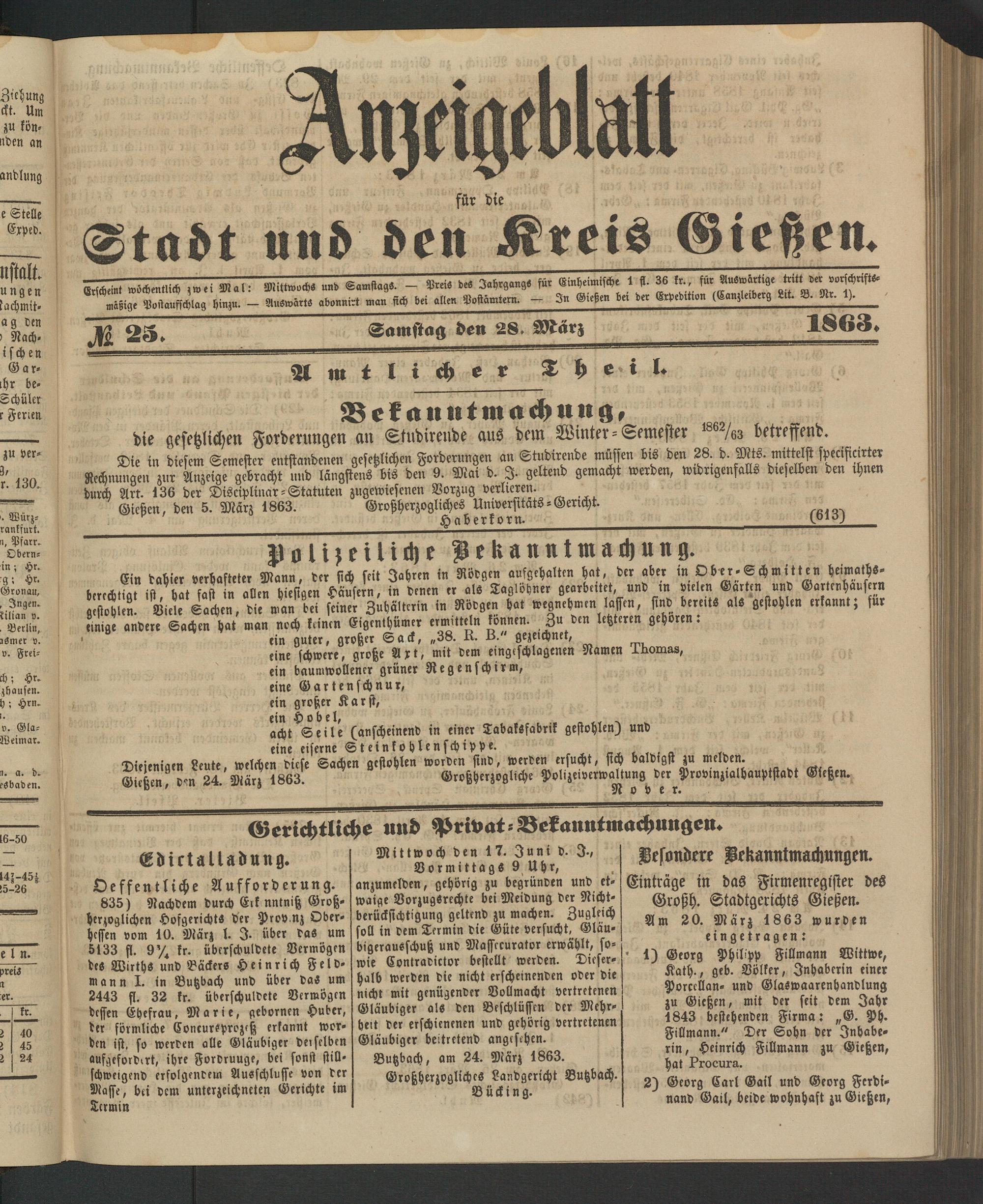 Anzeigeblatt für die Provinzialhauptstadt Gießen. 1840-1867