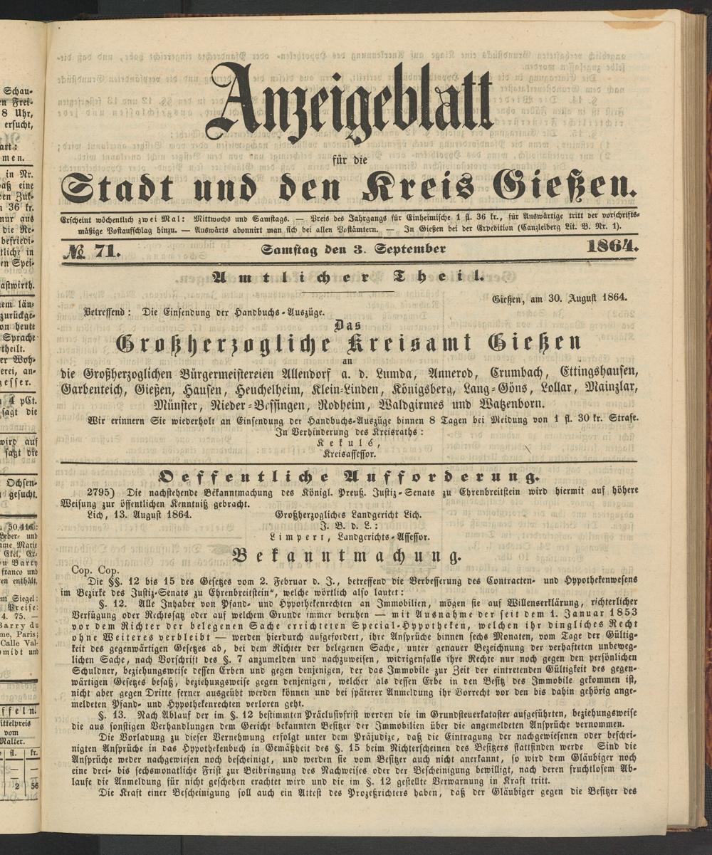 Anzeigeblatt für die Provinzialhauptstadt Gießen. 1840-1867