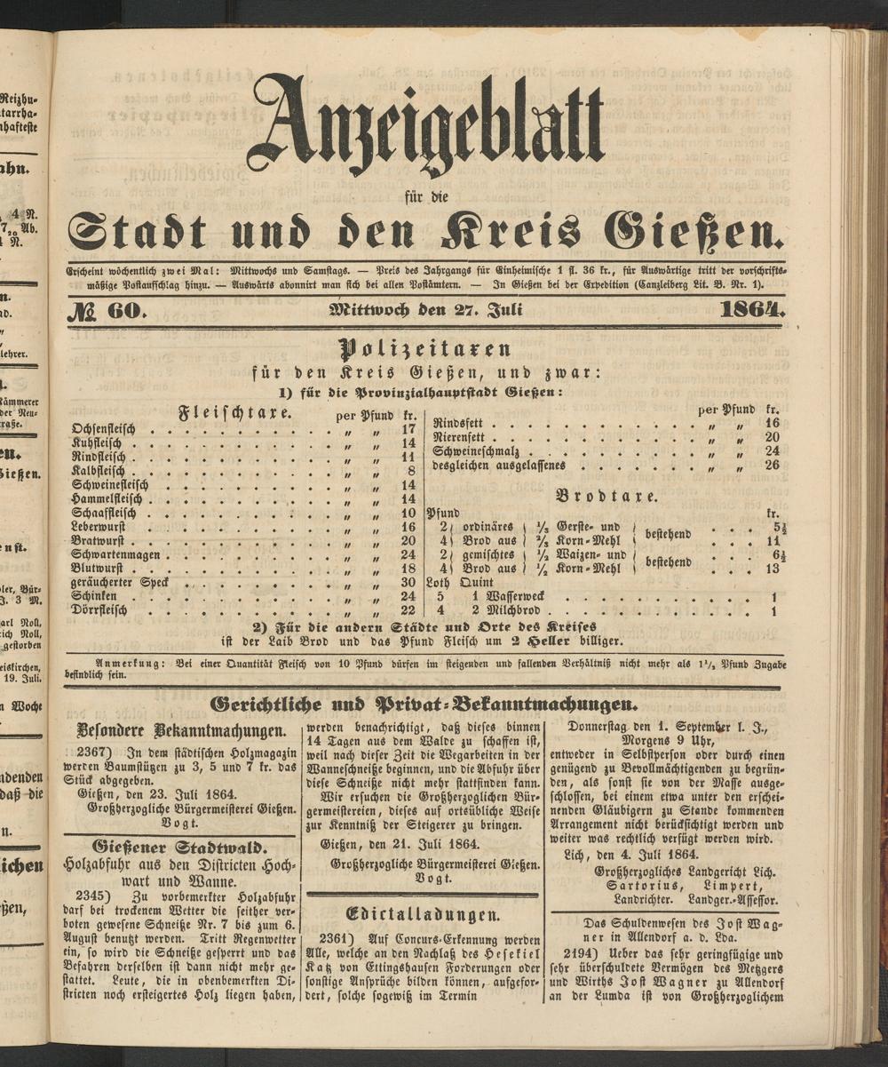Anzeigeblatt für die Provinzialhauptstadt Gießen. 1840-1867