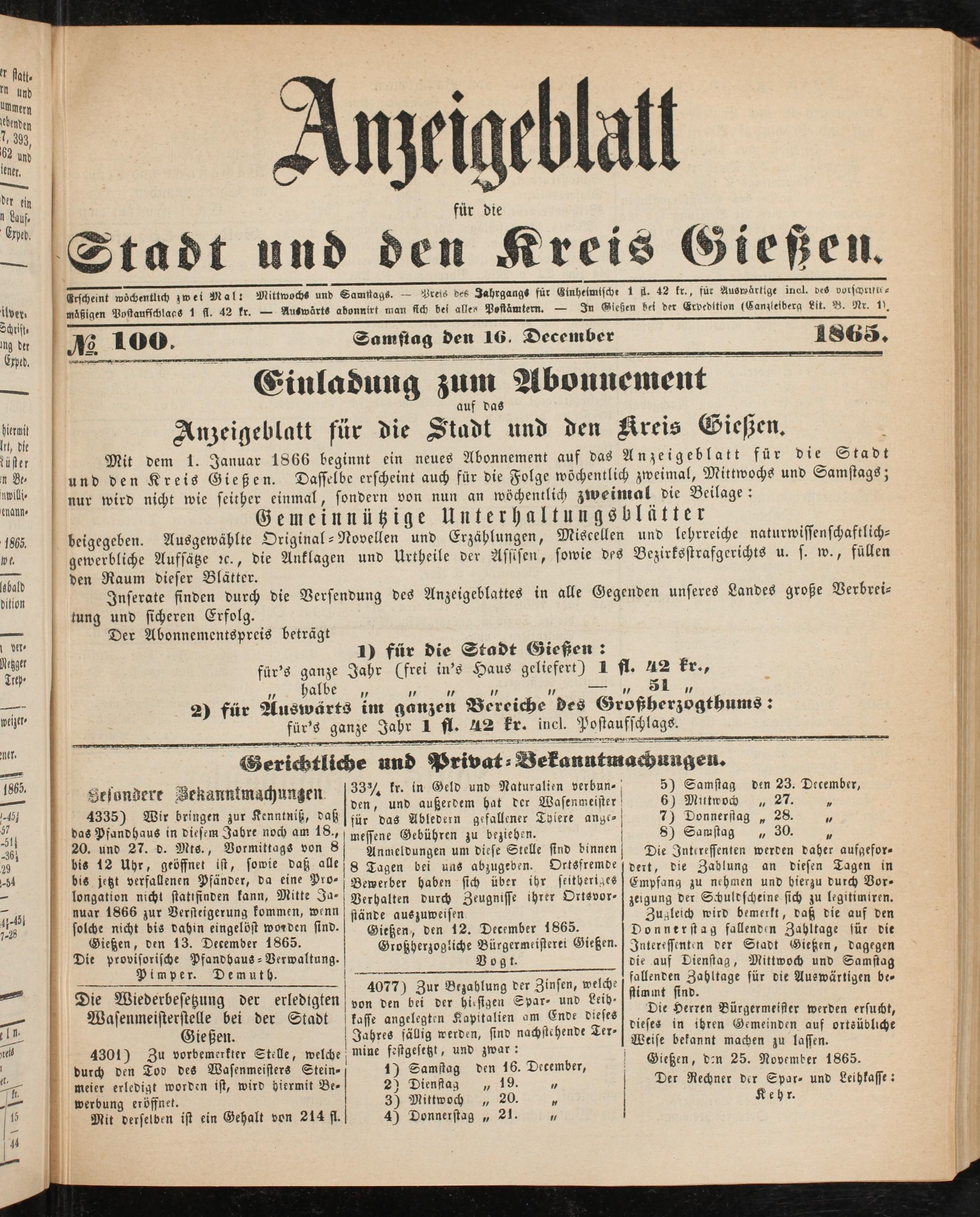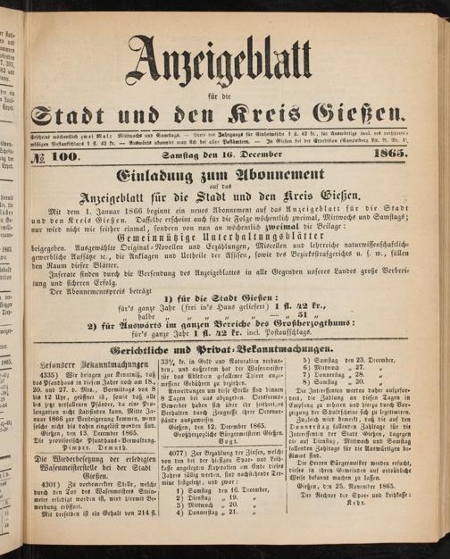 Anzeigeblatt für die Provinzialhauptstadt Gießen. 1840-1867