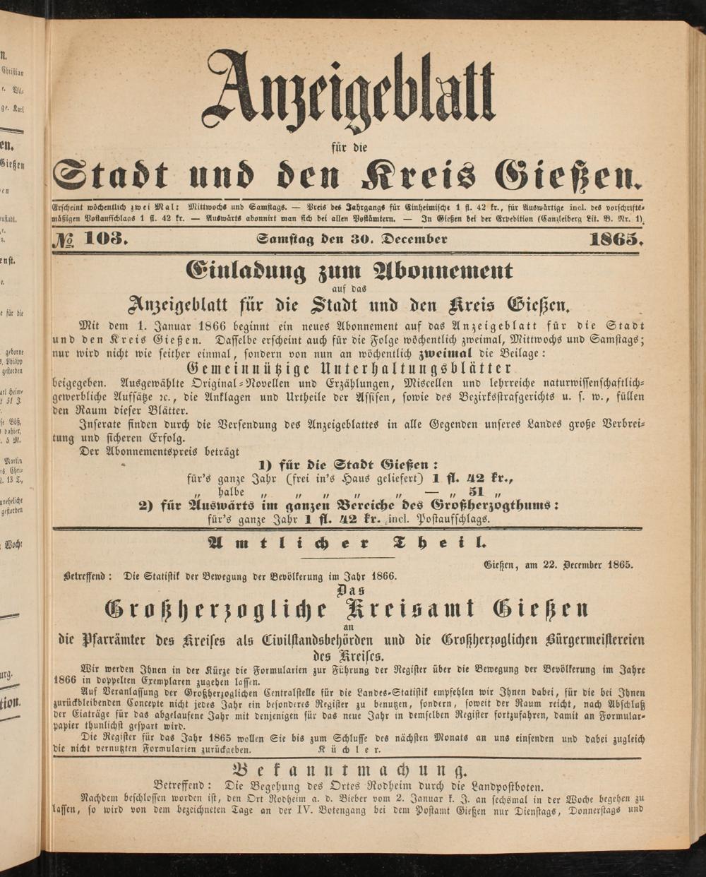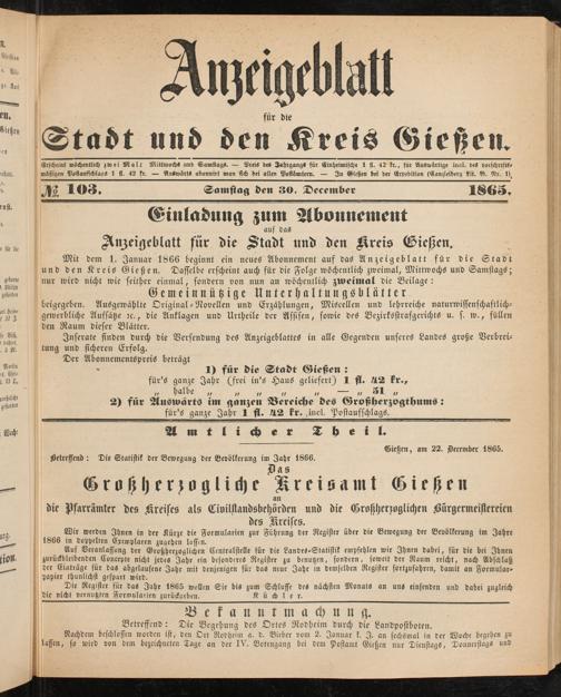 Anzeigeblatt für die Provinzialhauptstadt Gießen. 1840-1867