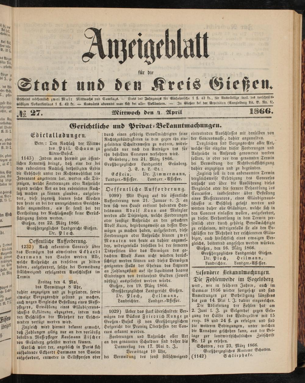 Anzeigeblatt für die Provinzialhauptstadt Gießen. 1840-1867