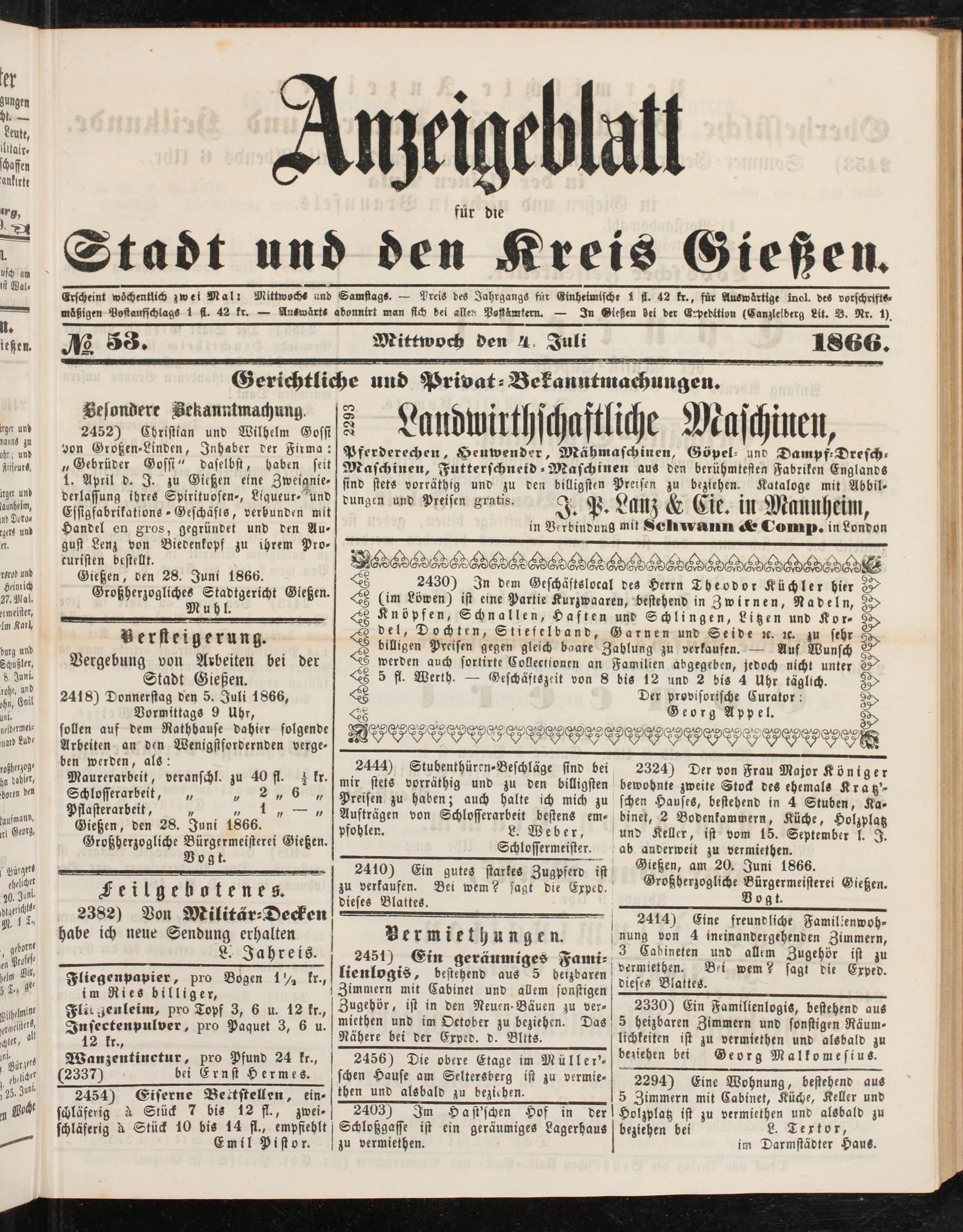 Anzeigeblatt für die Provinzialhauptstadt Gießen. 1840-1867