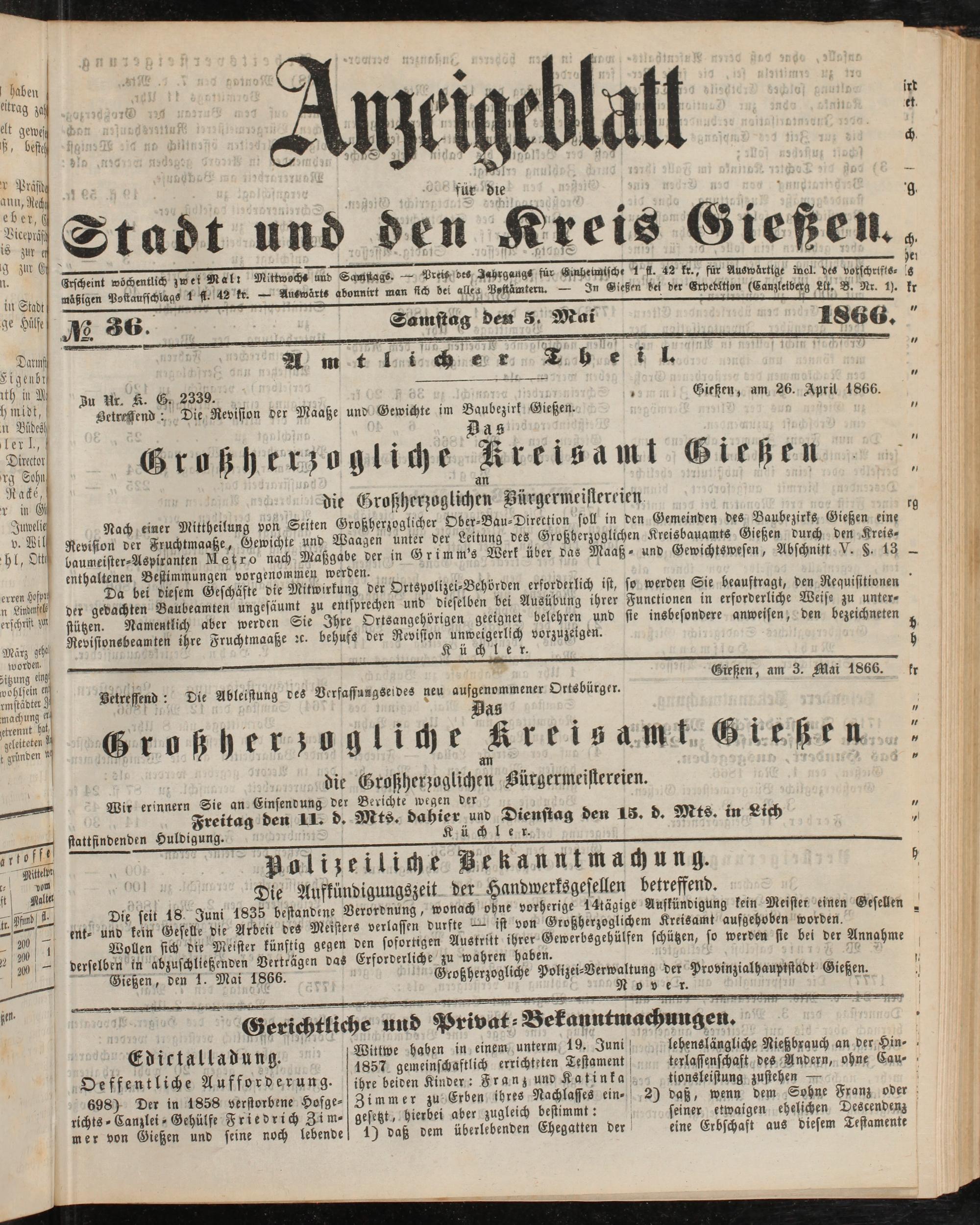 Anzeigeblatt für die Provinzialhauptstadt Gießen. 1840-1867