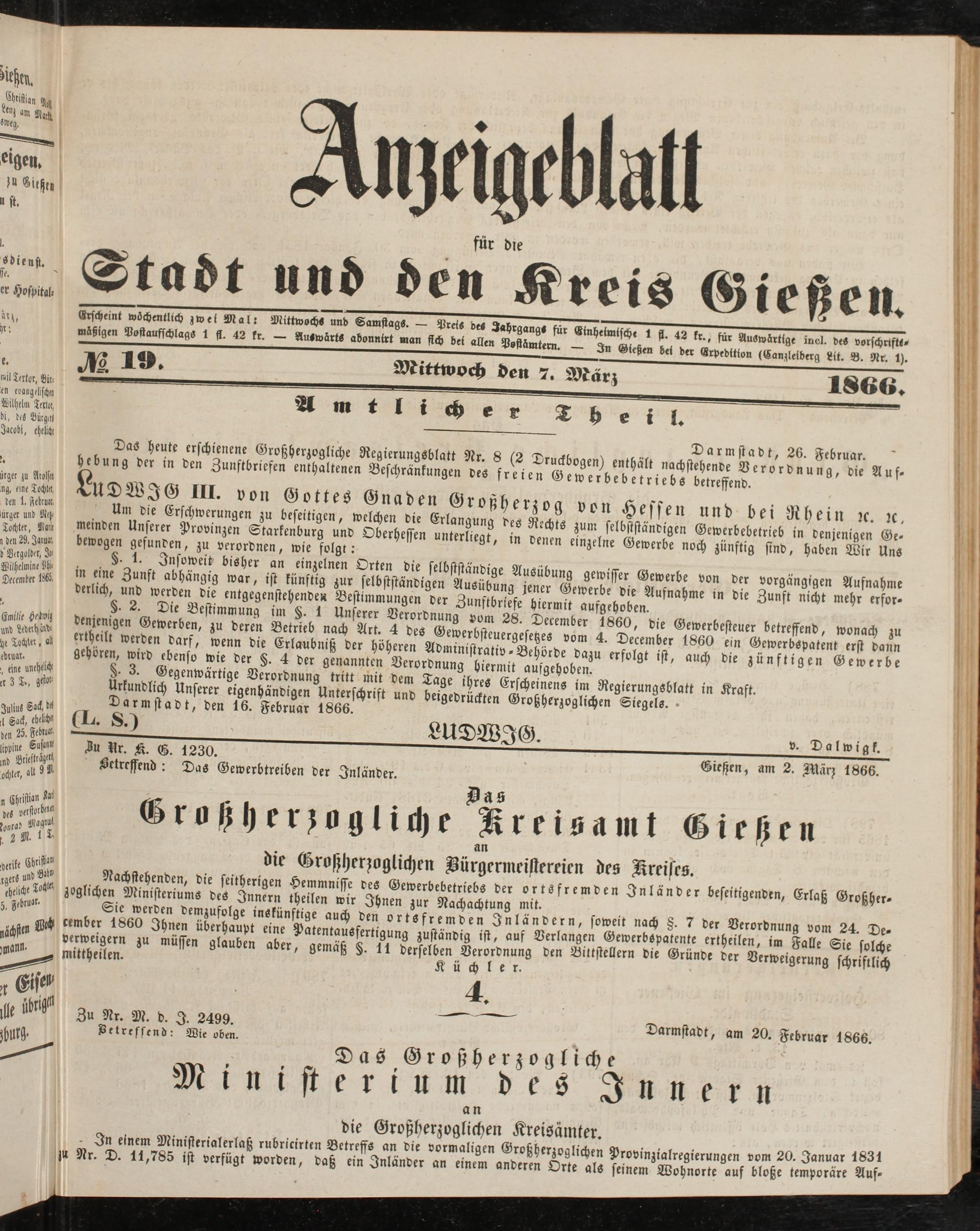 Anzeigeblatt für die Provinzialhauptstadt Gießen. 1840-1867