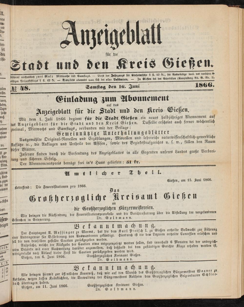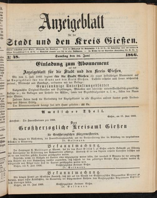 Anzeigeblatt für die Provinzialhauptstadt Gießen. 1840-1867