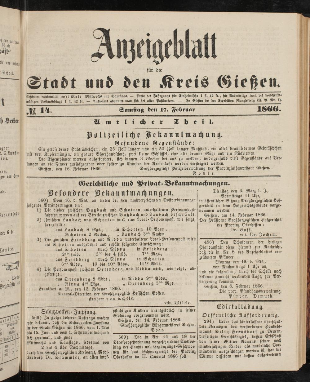 Anzeigeblatt für die Provinzialhauptstadt Gießen. 1840-1867