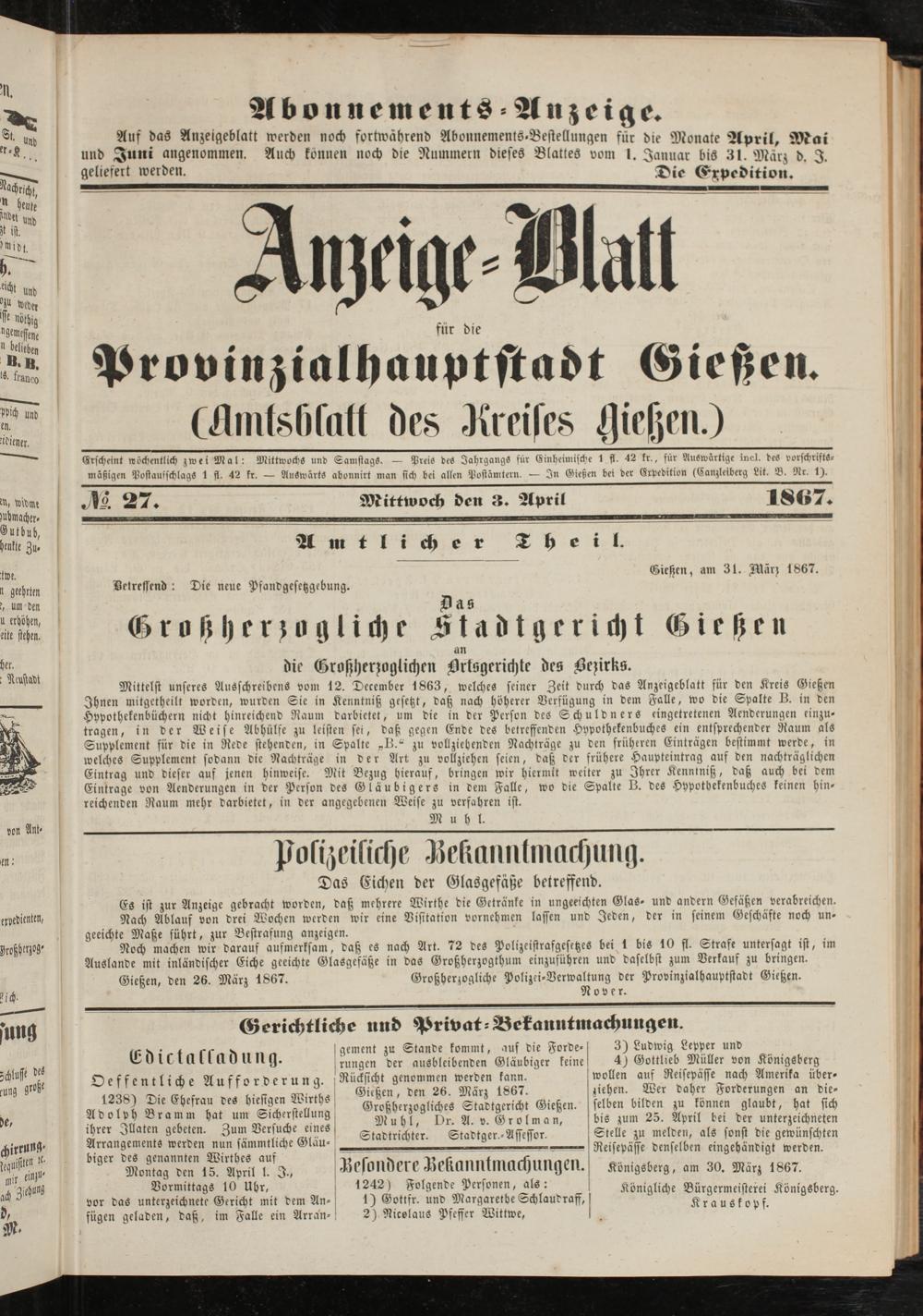 Anzeigeblatt für die Provinzialhauptstadt Gießen. 1840-1867