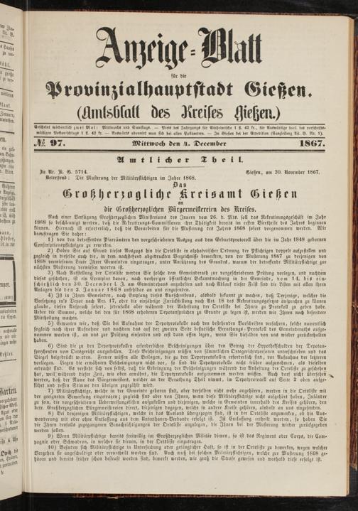 Anzeigeblatt für die Provinzialhauptstadt Gießen. 1840-1867
