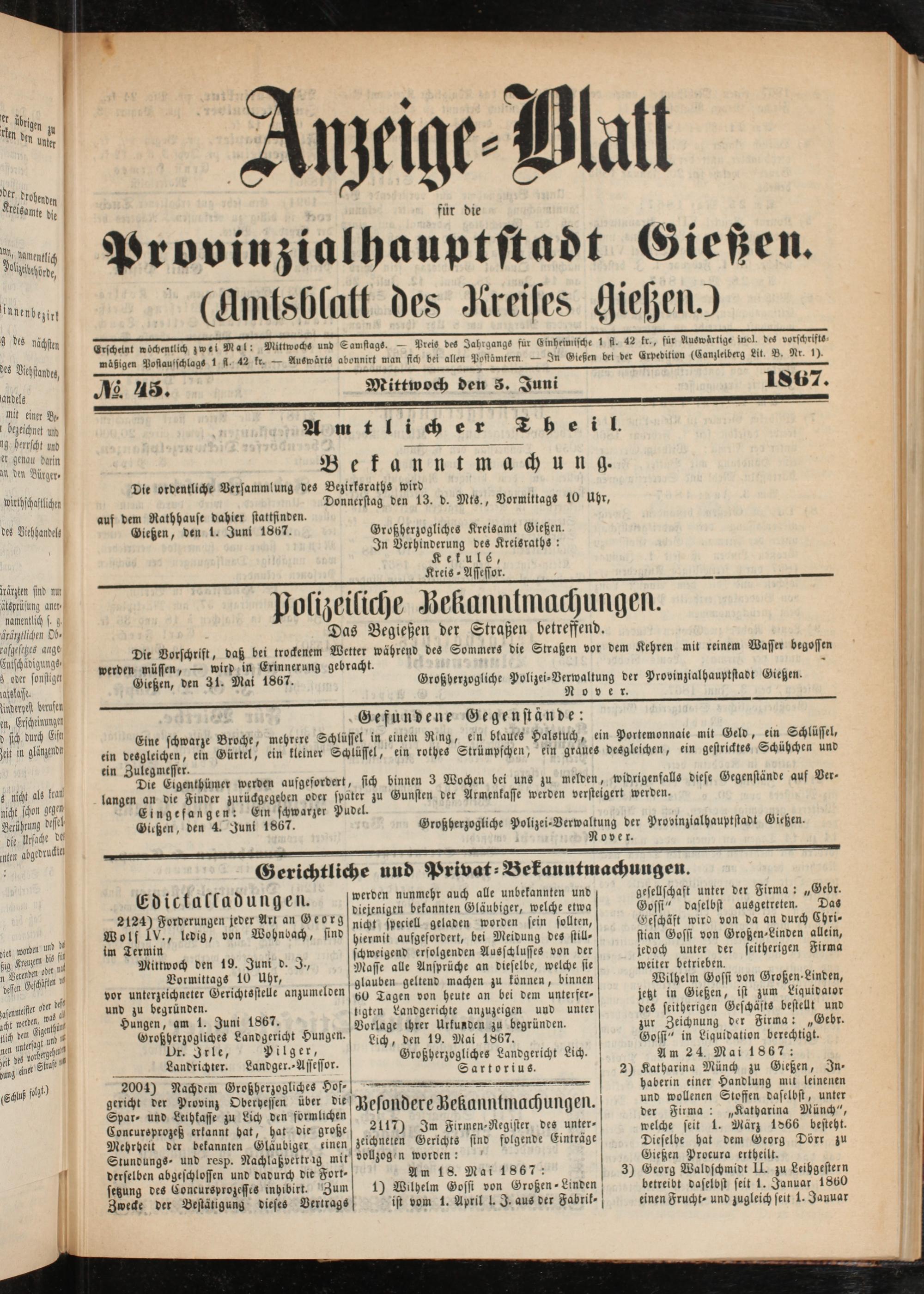 Anzeigeblatt für die Provinzialhauptstadt Gießen. 1840-1867