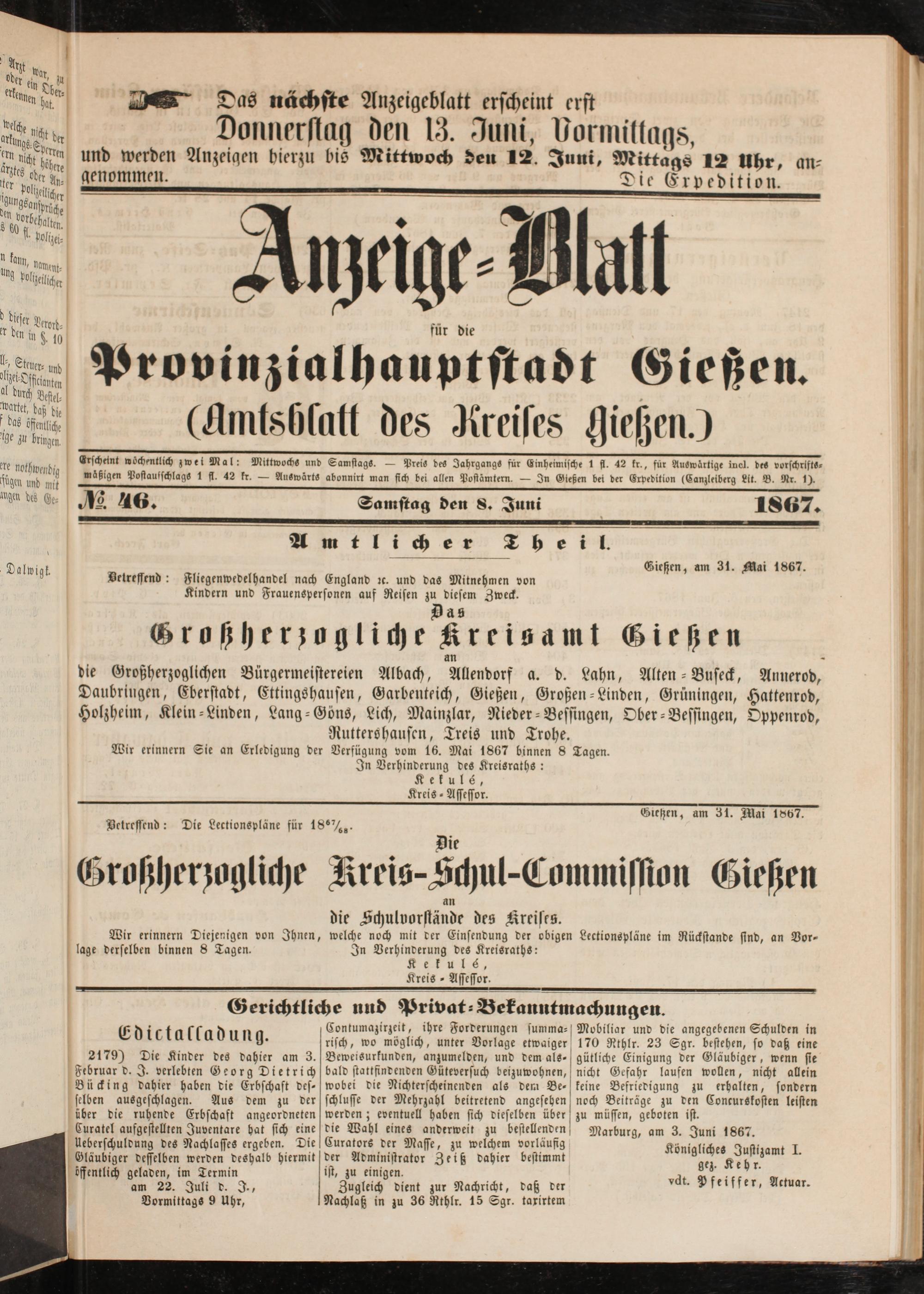 Anzeigeblatt für die Provinzialhauptstadt Gießen. 1840-1867