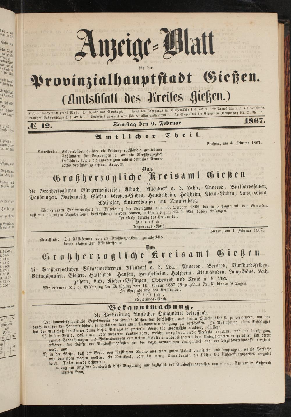 Anzeigeblatt für die Provinzialhauptstadt Gießen. 1840-1867