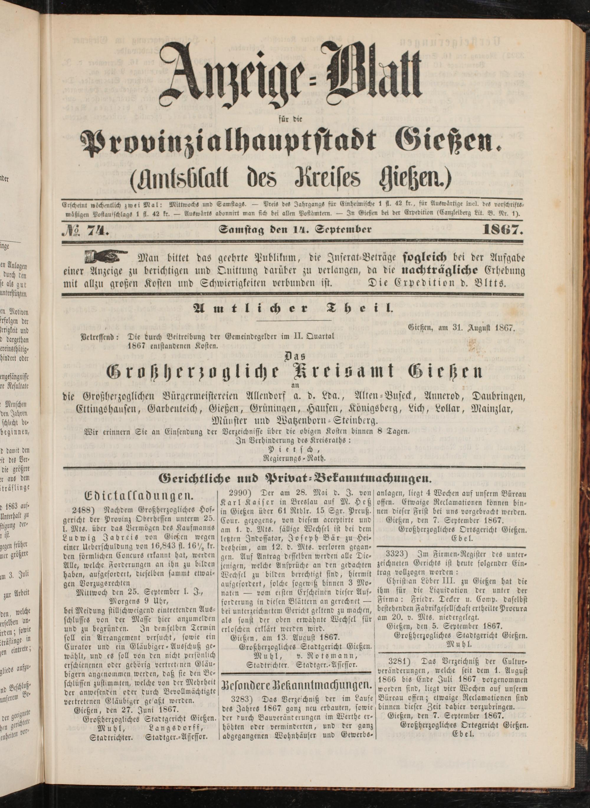 Anzeigeblatt für die Provinzialhauptstadt Gießen. 1840-1867