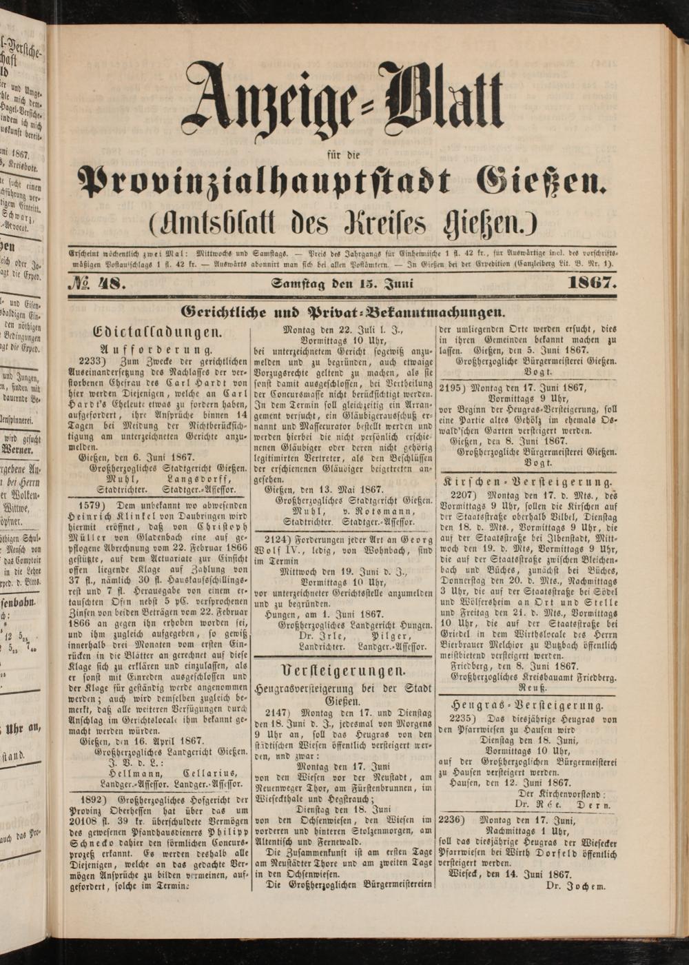 Anzeigeblatt für die Provinzialhauptstadt Gießen. 1840-1867