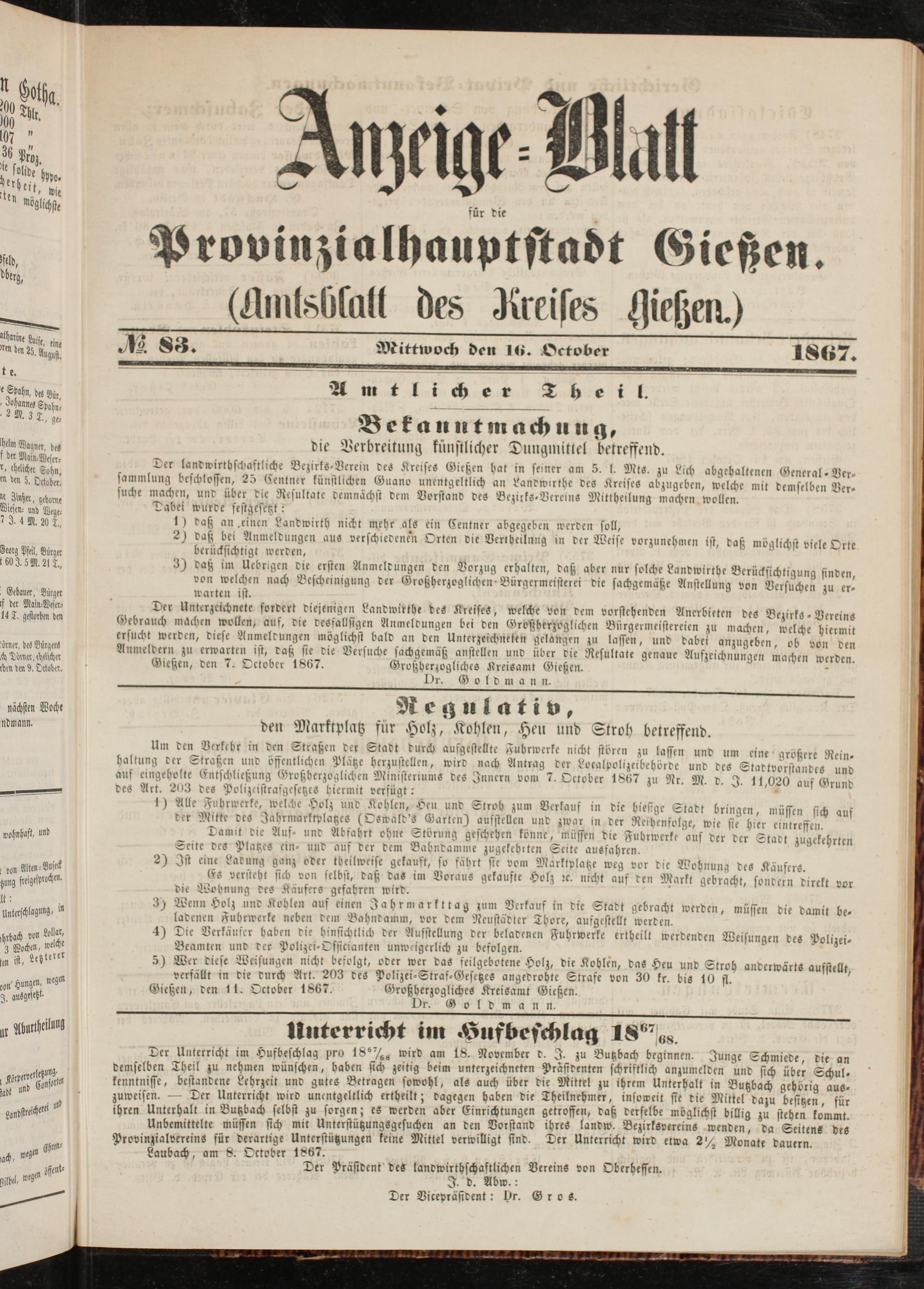 Anzeigeblatt für die Provinzialhauptstadt Gießen. 1840-1867