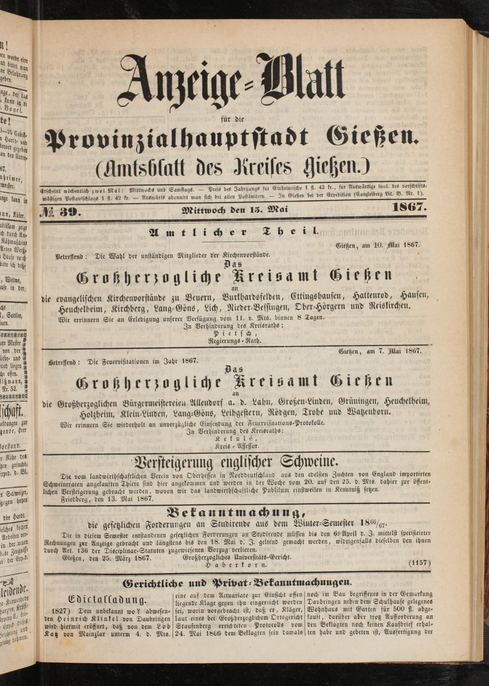 Anzeigeblatt für die Provinzialhauptstadt Gießen. 1840-1867