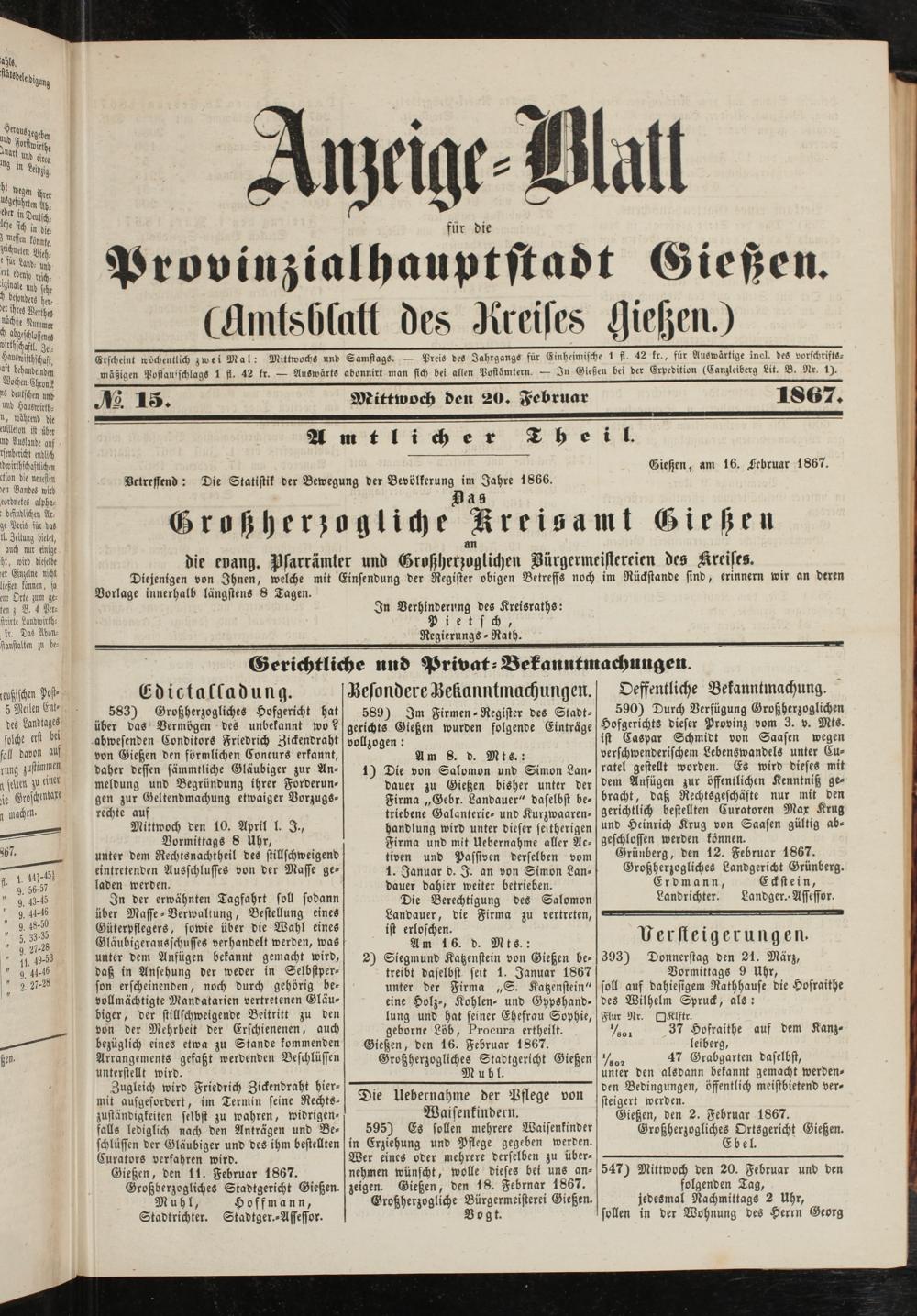 Anzeigeblatt für die Provinzialhauptstadt Gießen. 1840-1867
