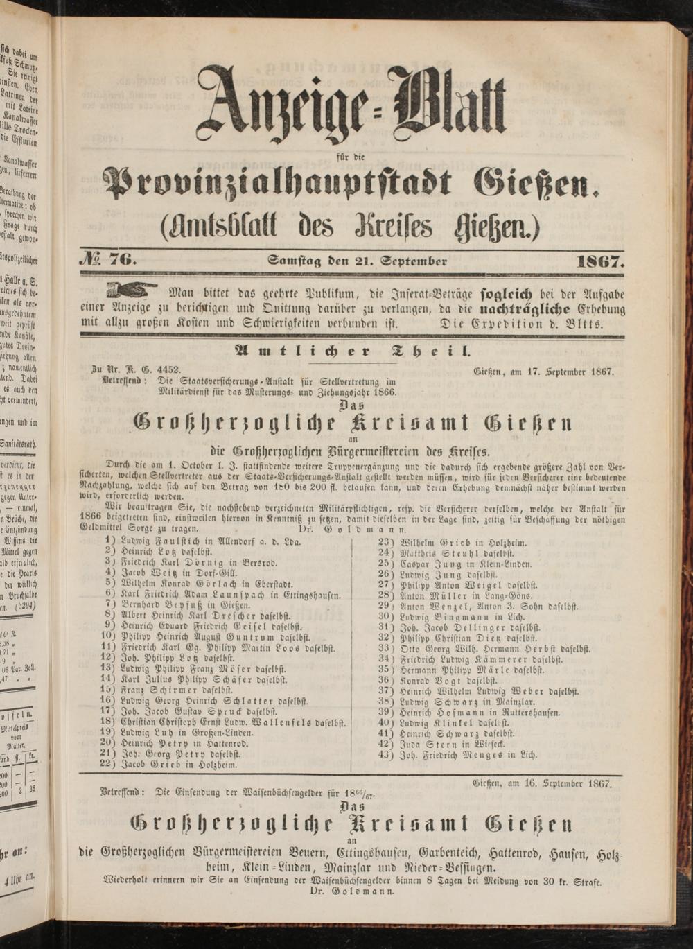 Anzeigeblatt für die Provinzialhauptstadt Gießen. 1840-1867