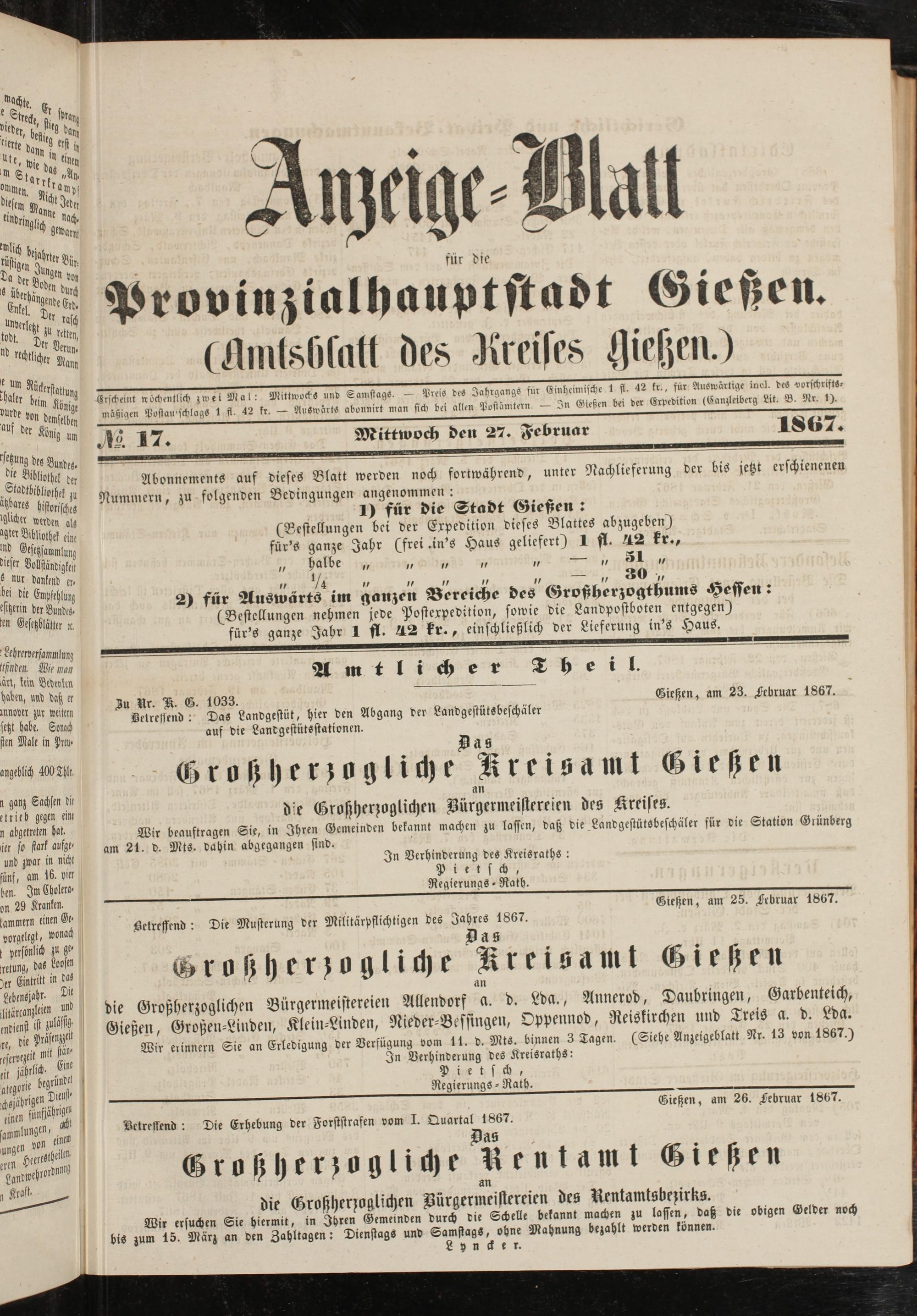 Anzeigeblatt für die Provinzialhauptstadt Gießen. 1840-1867