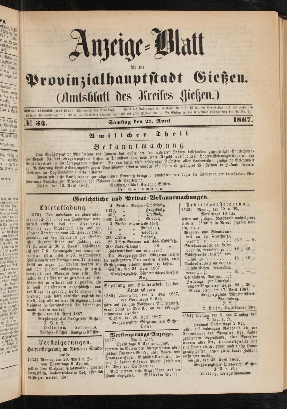 Anzeigeblatt für die Provinzialhauptstadt Gießen. 1840-1867