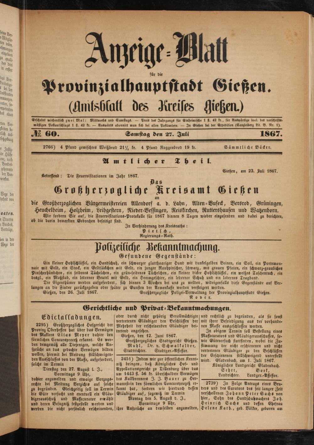 Anzeigeblatt für die Provinzialhauptstadt Gießen. 1840-1867