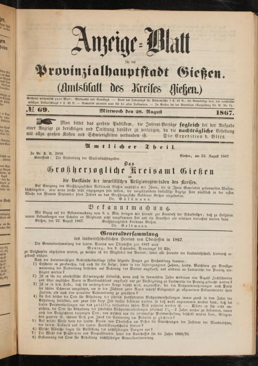 Anzeigeblatt für die Provinzialhauptstadt Gießen. 1840-1867