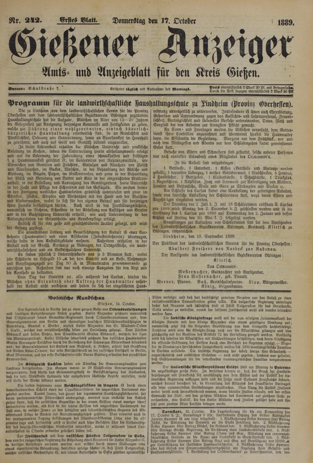 17.10.1889 Erstes Blatt