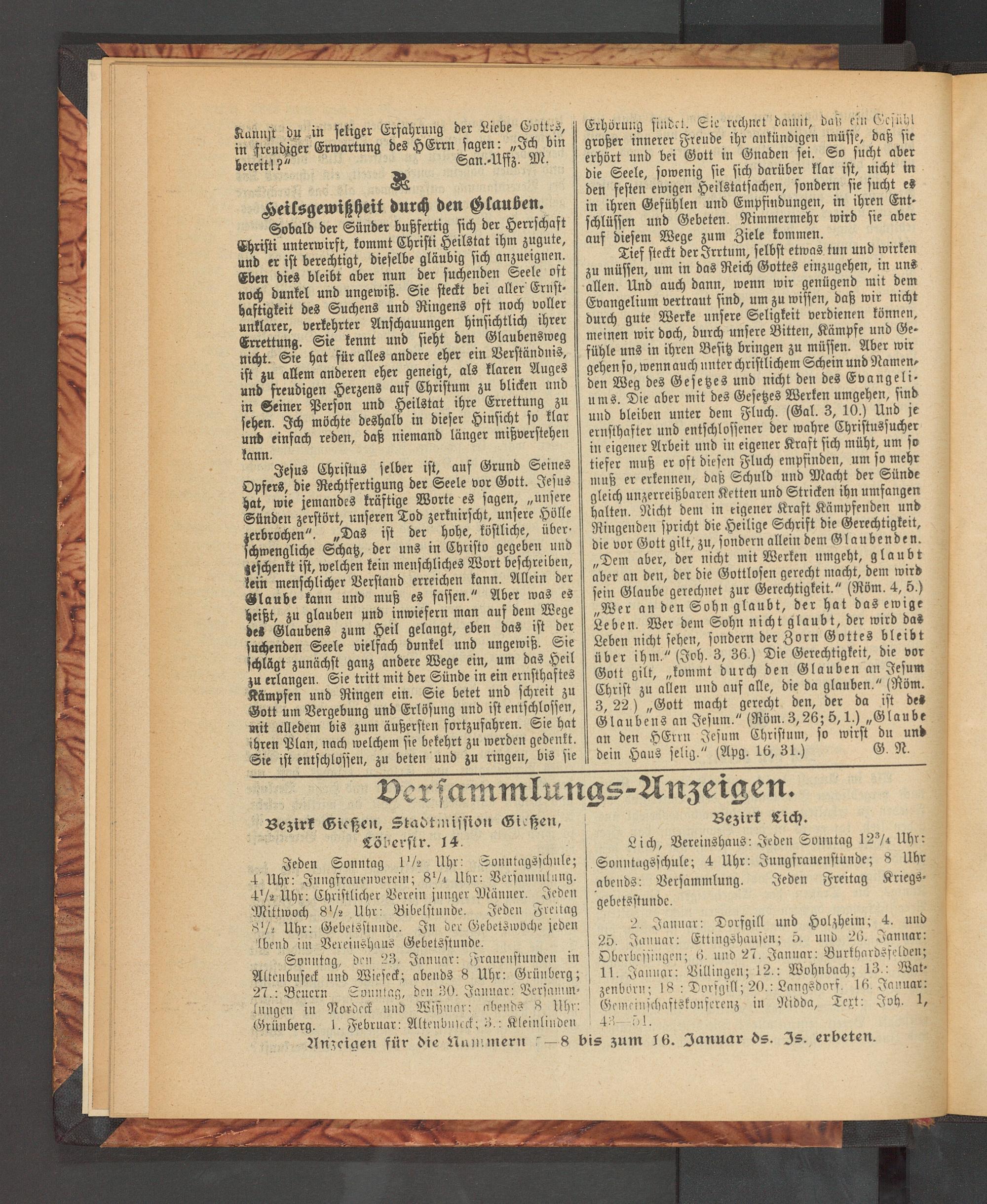 Lich, Vereinshaus: Jeden Sonntag 12^/r Uhr: Sonntagsschule; 4 Uhr: Jungfrauenstunde; 8 Ubr abends: Versammlung. Jeden Freitag Kriegs- gebetsstunde.