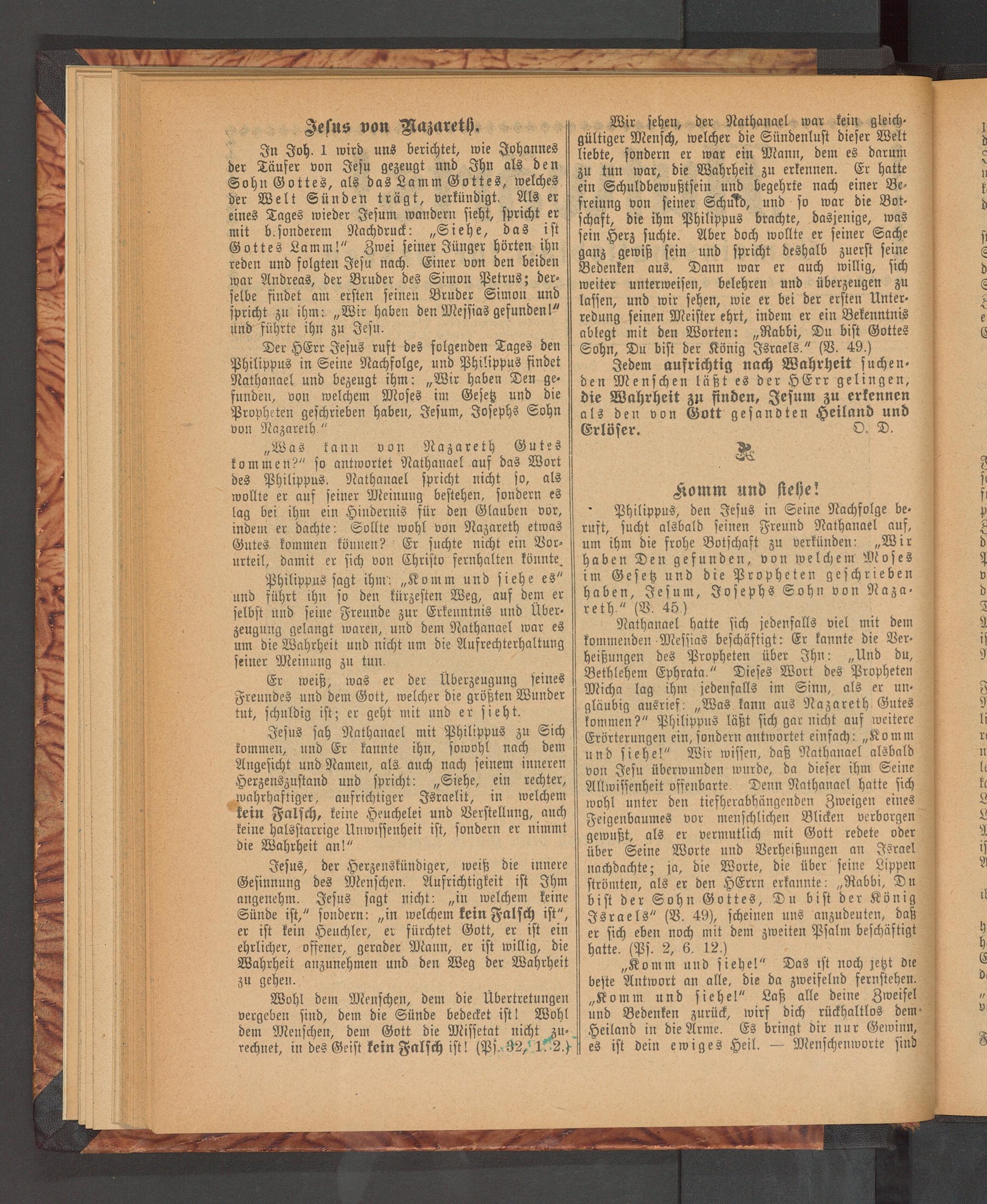 Wir sehen, der Nathanael war kein gleichgültiger Mensch, welcher die Sündenlust dieser Welt liebte, sondern er war ein Mann, dem es darum zu tun war, die Wahrheit zu erkennen. Er hatte ein Schuldbewußtsein und begehrte nach einer Befreiung von seiner Schuld, und so war die Botschaft, die ihm Philippus brachte, dasjenige, was sein Herz suchte. Aber doch wollte er seiner Sache ganz gewiß sein und spricht deshalb zuerst seine Bedenken aus. Dann war er auch willig, sich weiter unterweisen, belehren und überzeugen zu lassen, und wir sehen, wie er bei der ersten Unterredung seinen Meister ehrt, indem er ein Bekenntnis ablegt mit den Worten: „Rabbi, Du bist Gottes Sohn, Du bist der König Israels." (V. 49.)