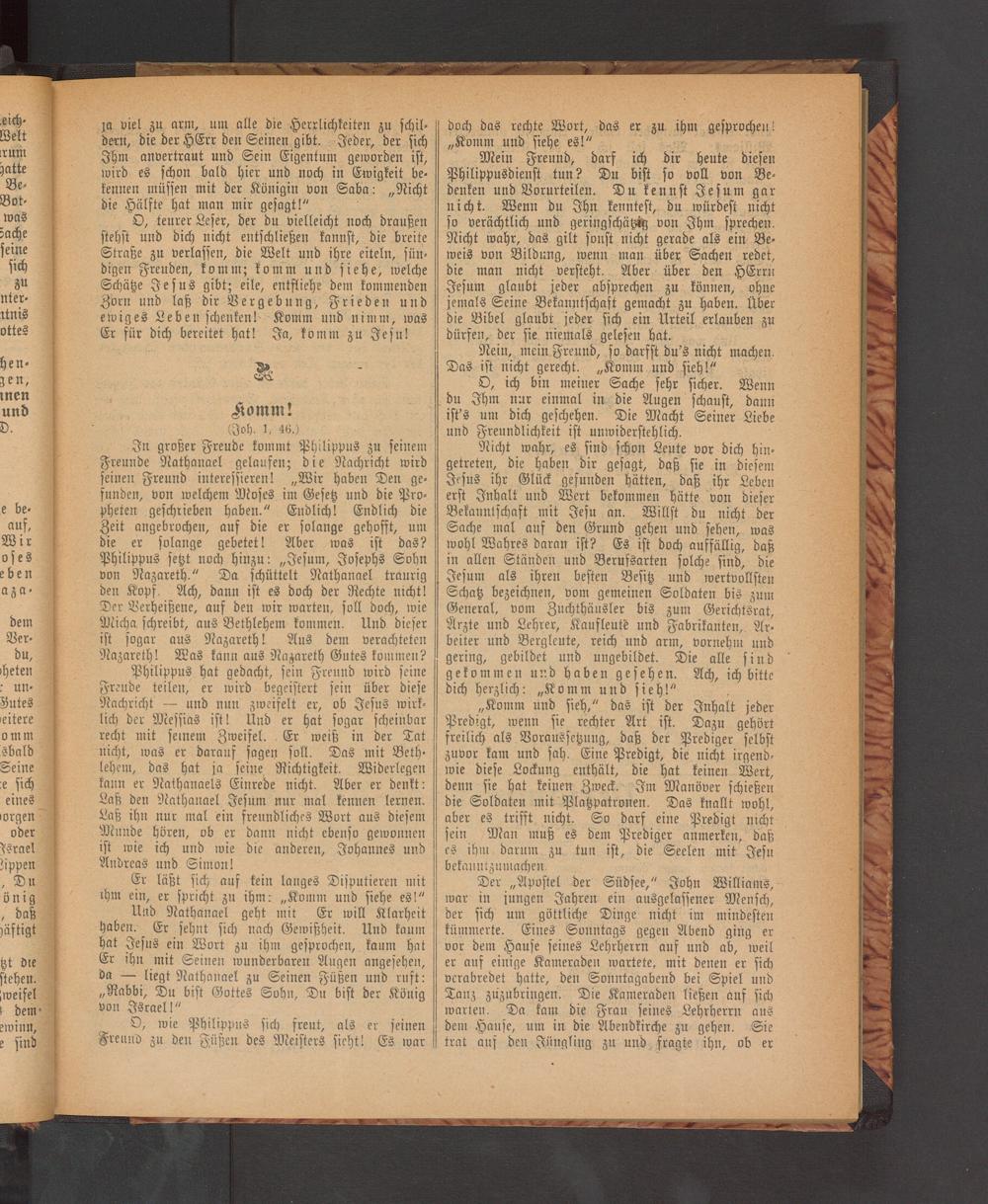 Der „Apostel der Südsee," John Williams, >var in jungen Jahren ein ausgelassener Mensch, der sich um göttliche Dinge nicht im mindesten kümmerte. Eines Sonntags gegen Abend ging er vor dem Hause seines Lehrherrn auf und ab, weil er auf einige Kameraden wartete, mit denen er sich verabredet hatte, den Sonntagabend bei Spiel und Tanz züzubriugen. Die Kameraden ließen auf sich warten. Da kam die Frau seines Lehrherrn aus deni Hause, um in die Abendkirche zu gehen. Sie trat auf den Jüngling zu und. fragte ihn, ob er