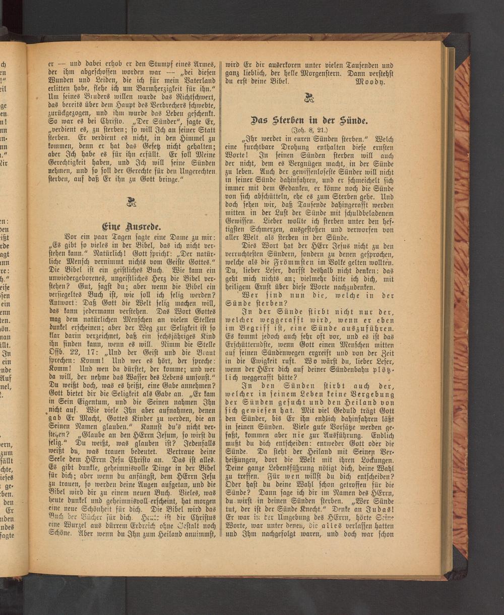 „Ihr werdet in euren Sünden sterben." Welch eine furchtbare Drohung enthalten diese ernsten Worte! In seinen Sünden sterben will auch der nicht, dem es Vergnügen macht, in der Sünde zu leben. Auch der gewissenloseste Sünder will nicht in seiner Sünde dahinfahren, und er schmeichelt sich immer mit dem Gedanken, er könne noch die Sünde von sich abschütteln, ehe es zum Sterben gehe. Und doch sehen wir, daß Tausende dahingerafft werden mitten in der Lust der Sünde mit schuldbeladenem Gewissen. Lieber wollte ich sterben unter den heftigsten Schmerzen, ausgestoßen und verworfen von aller Welt, als sterben in der Sünde.