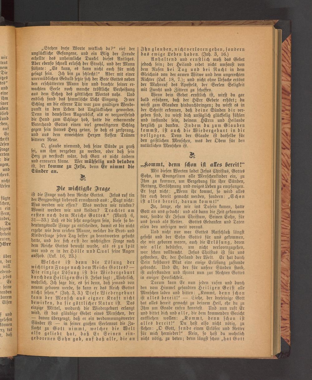 ist die Frage nach dem Reiche Gottes. Jesus ruf tin der Bergpredigt liebevoll ermahnend aus: „Sagt nicht: Mas werden wir essen? Was werden wir trinken? Womit werden wir uns kleiden? Trachtet am ersten nach dem Reiche Gottes." (Matth 6, 31—33.) Laß es dir sehr angelegen sein, diese so bedeutungsvolle Frage zu entscheiden, damit es dir nicht ergehe wie dem reichen Manne, welcher die Brot- und Kleiderfrage jeden Tag besser zu beantworten gesucht hatte, und der sich erst der wichtigsten Frage nach dem Reiche Gottes bewußt wurde, als es zu spät war und er in der Hölle und Qual seine Augen aufhob. (Luk. 16, 23.)